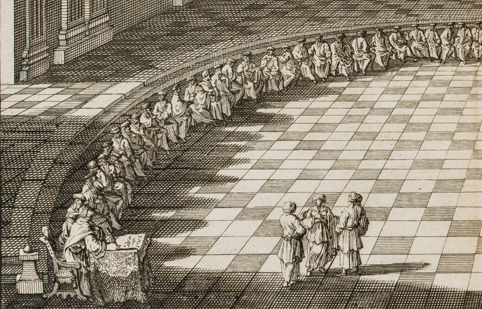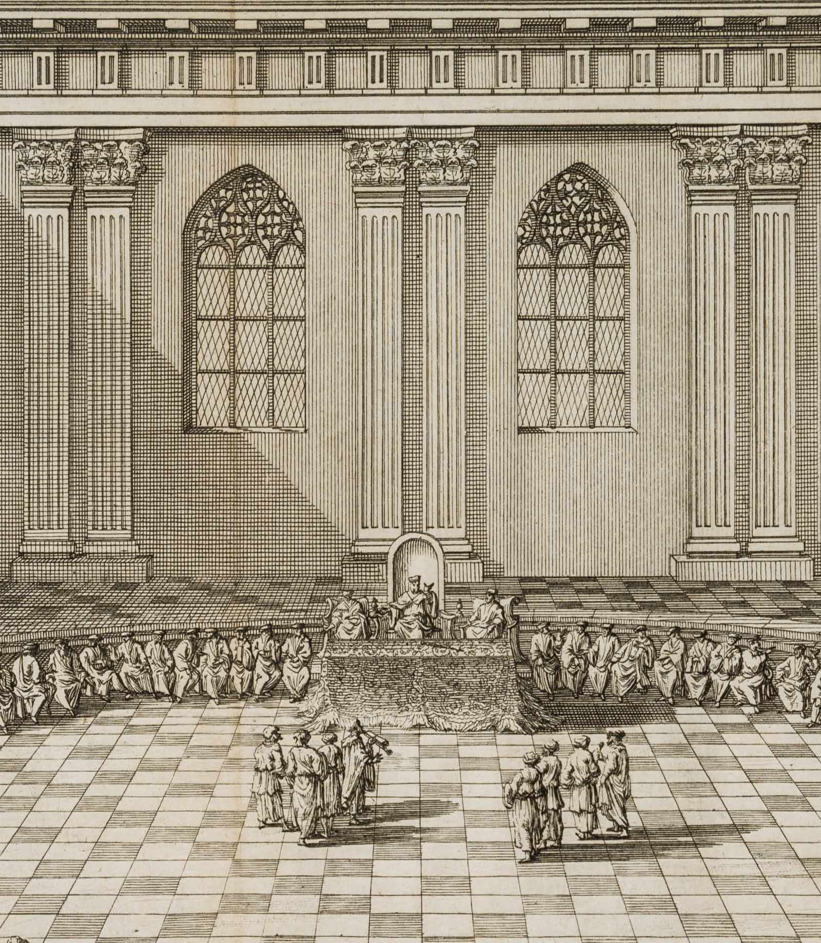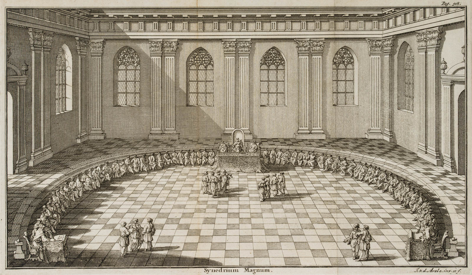 Johannes van den Avele (1655 Amsterdam – 1727 Stockholm), Synedrium Magnum, “der große Rat”, “das Obergericht”, aus einem Buch, 18. Jahrhundert, Radierung