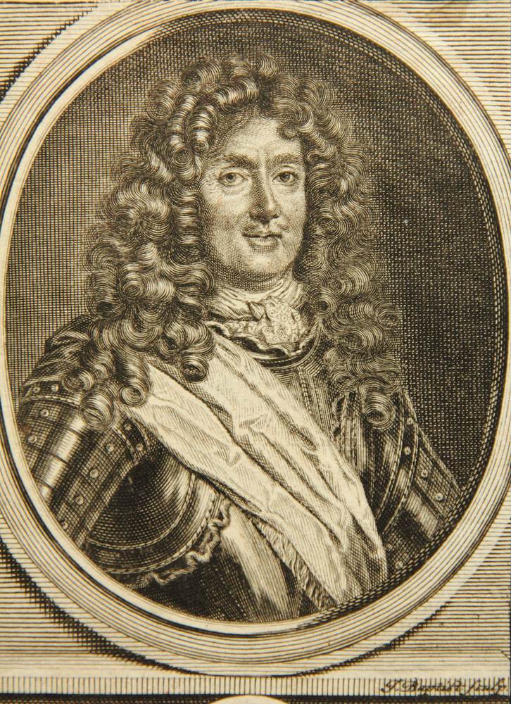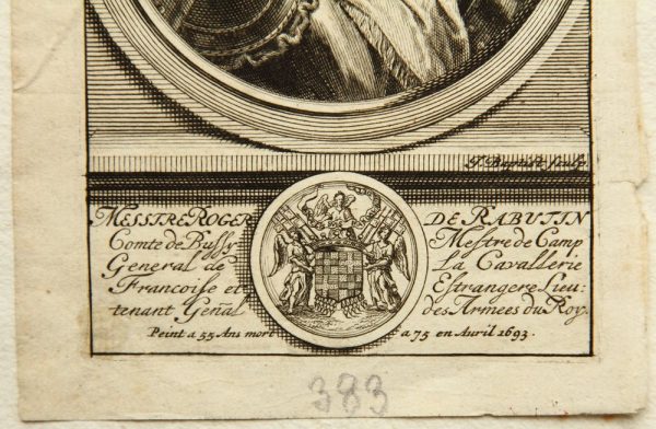 - Bezeichnung: Unterhalb der Darstellung in der Druckplatte signiert sowie Namen, Titeln und militärischen Rängen des Dargestellten bezeichnet. Mittig befindet sich das Familienwappen. Darunter befindet sich eine Bezeichnung des Künstlers “Peint a 55 Ans mort a 75 en April 1693”.