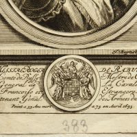 - Inscription: Signed below the image in the printing plate and inscribed with the sitter’s name, titles and military ranks. In the center is the family coat of arms. Below is an inscription of the artist “Peint a 55 Ans mort a 75 en April 1693”.