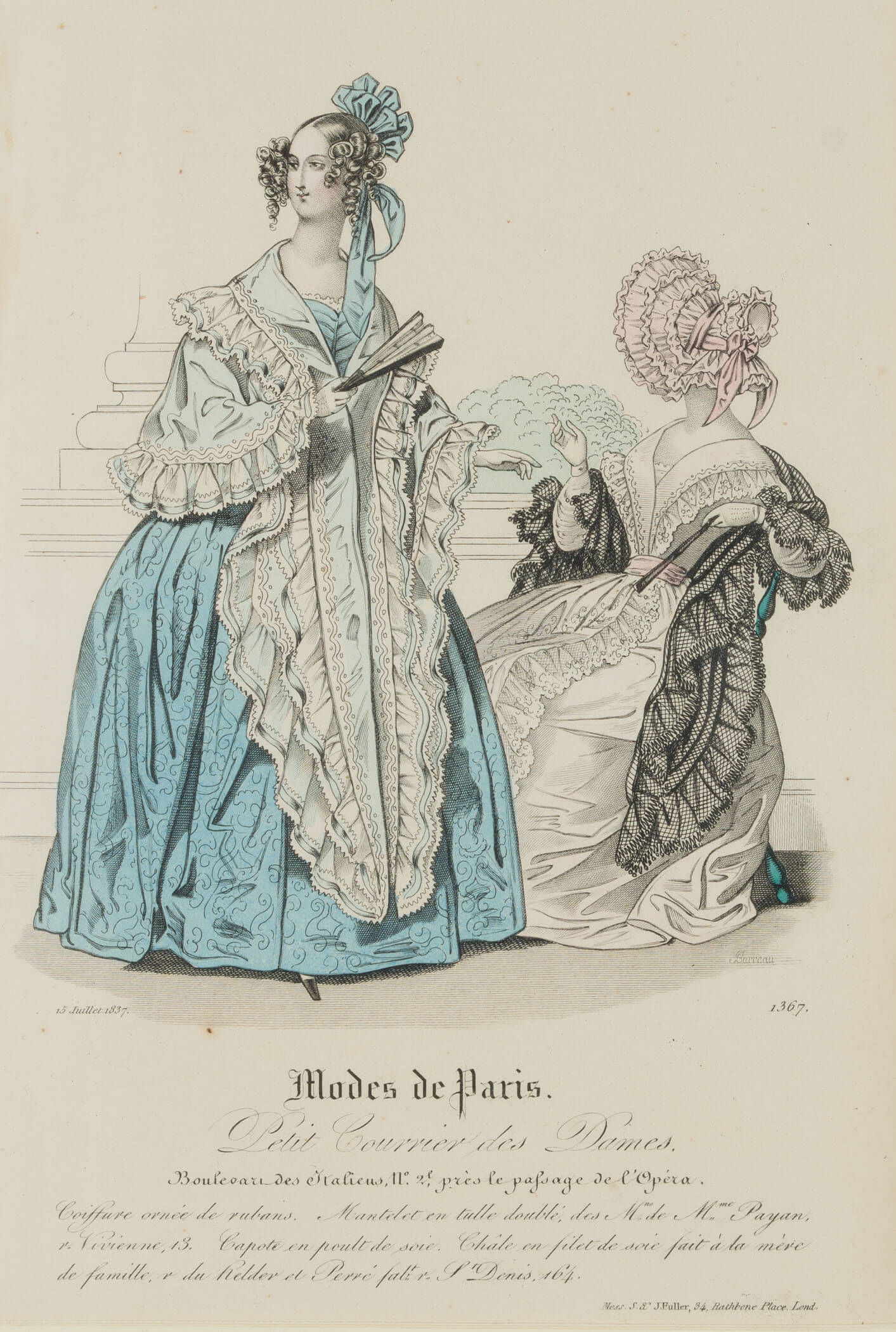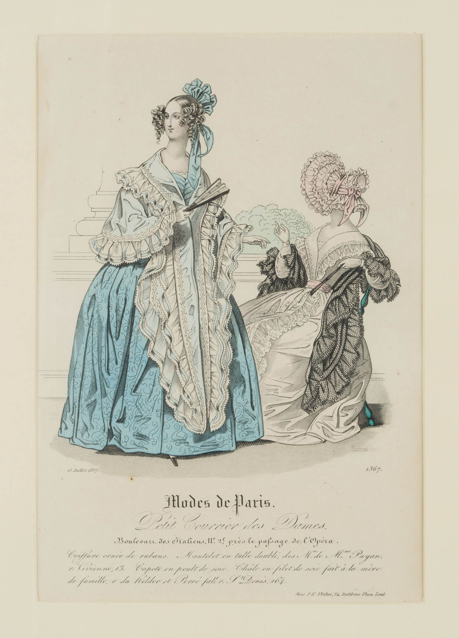 - Inscription: Lower right signed in the printing plate: “Barreau”. Lower middle inscribed in the printing plate: “Modes de Paris. […]”. Lower right numbered in the printing plate: “1367”. lower left dated: “15 Juillet 1837”.