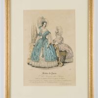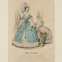 - Beschreibung: Französische Mode mit Dame im eleganten ausladenden Kleid mit Haube. Im Hintergrund rechts sitzende Dame als Rückenfigur