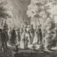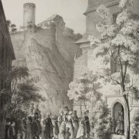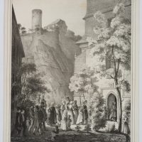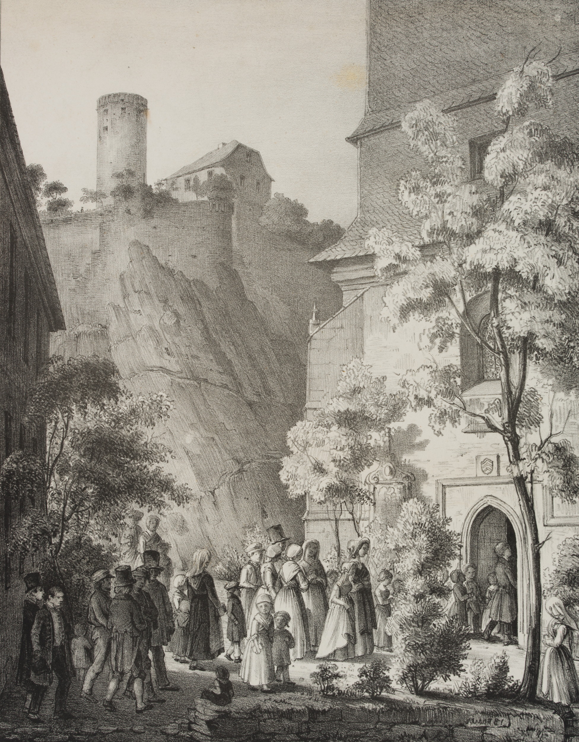 Johann Balthasar Bauer (1811 Frankfurt on the Main – 1883 ibid.), Entrance to the church in Eppstein before the start of mass with the faithful, c. 1860, Lithography