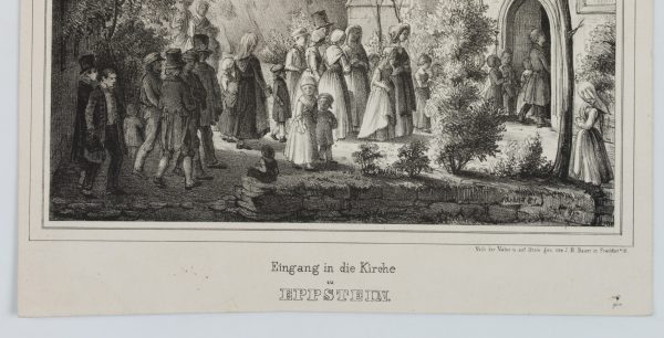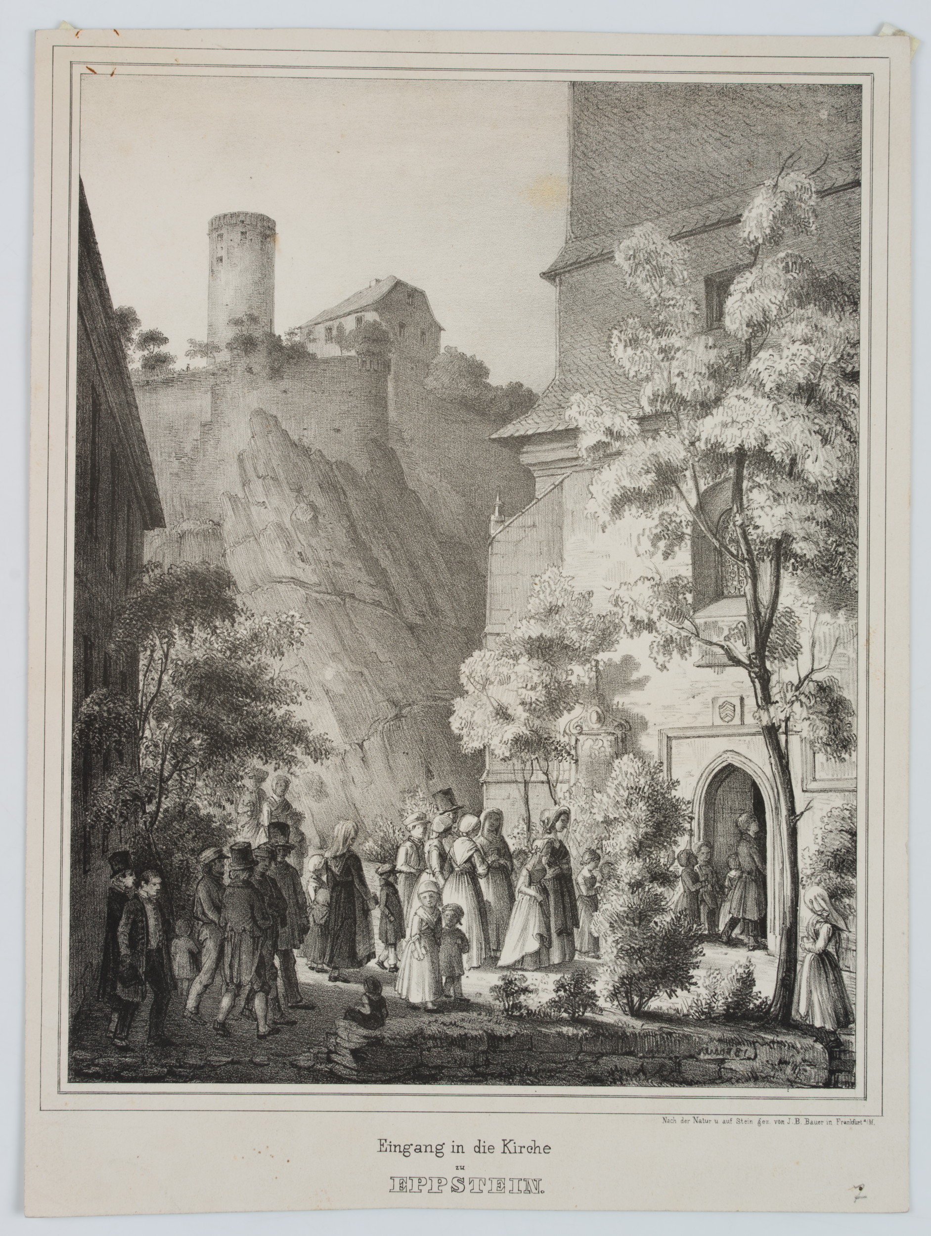 - Inscription: Lower right signed in the printing plate: „Nach der Natur u. auf Stein gez. von J. B. Bauer in Frankfurt a/M.“. Lower middle inscribed in the printing plate: „Eingang in die Kirche zu Eppstein“.