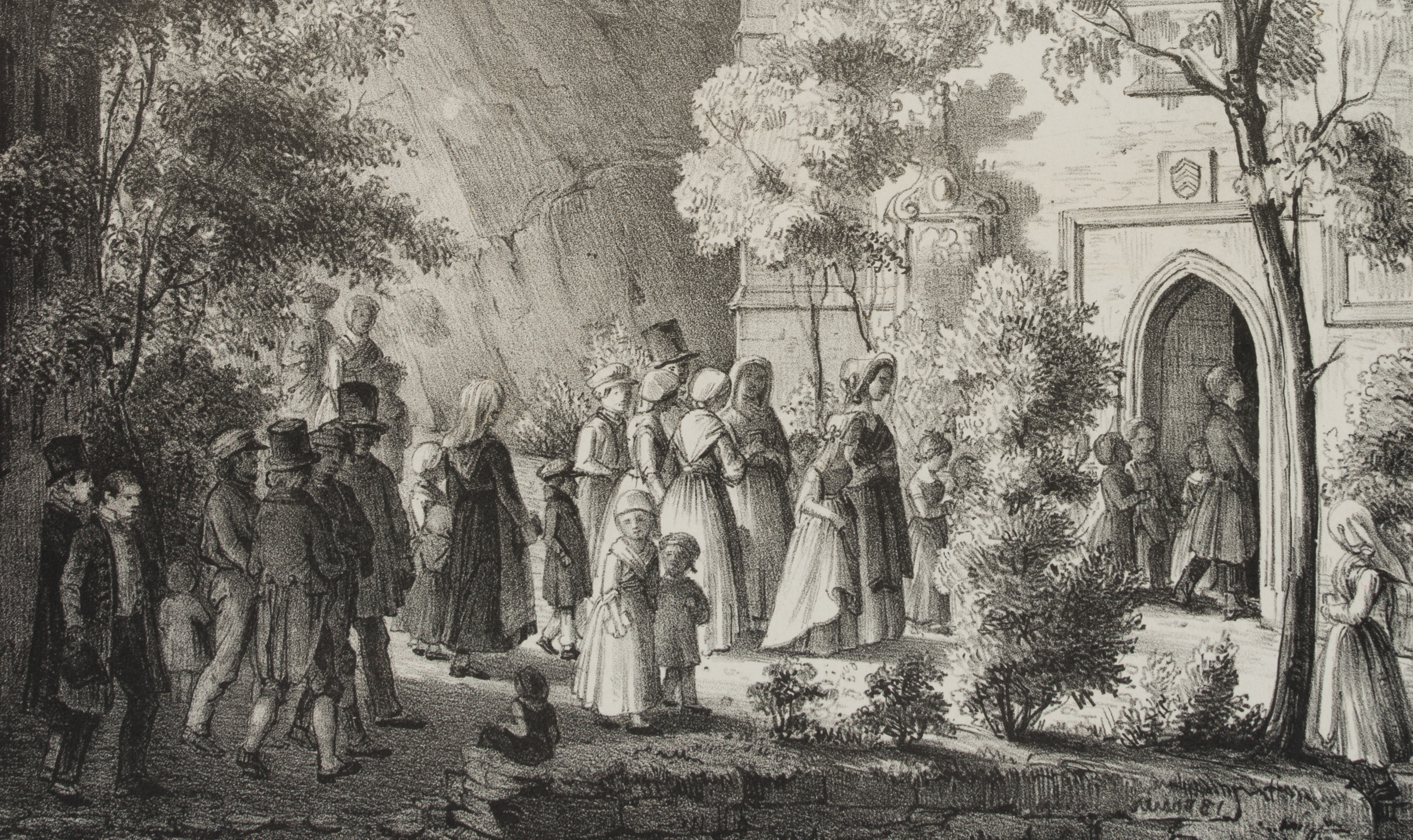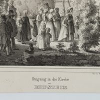 Johann Balthasar Bauer (1811 Frankfurt am Main – 1883 ebd.), Eingang in die Kirche zu Eppstein vor Messebeginn mit Gläubigen, um 1860, Lithographie