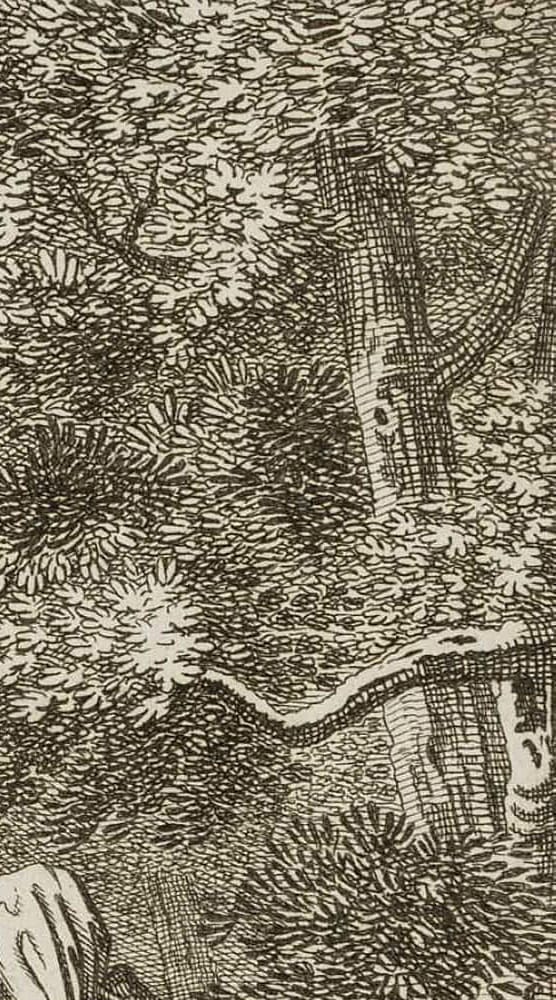 - Beschreibung: Miniaturisierte Szene als Illustration zu Gustav Schillings Erzählung “Die Ignoranten”. Zeigt eine vermummte Gestalt – den Ignoranten-, die von einer verschleierten Wahrsagerin in den Wald geführt wird.