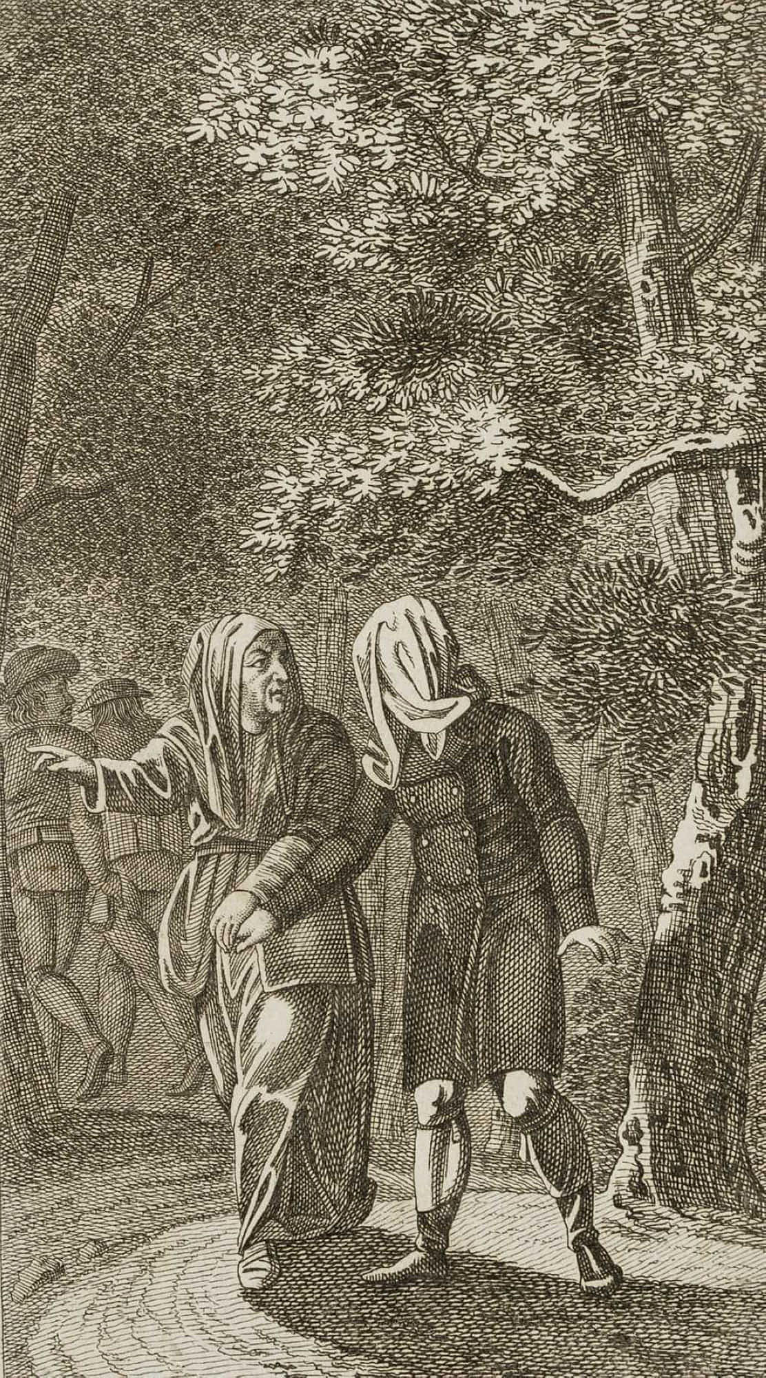 - Description: Miniature scene as illustration for Gustav Schilling’s story “Die Ignoranten”. Shows a hooded figure – the ignoramus – being led into the forest by a veiled fortune teller.