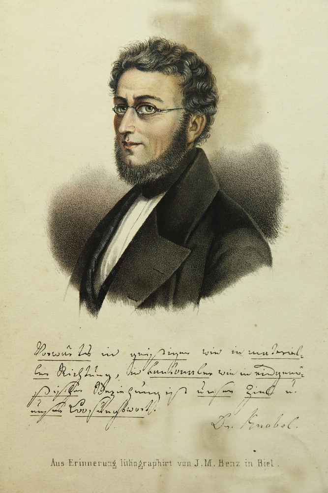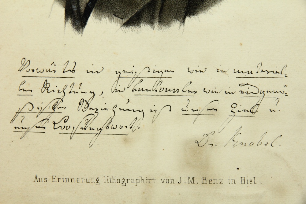 - Inscription: Below the image in the stone with German dedication and signed (in his own hand?) by Dr. Knobel. Below inscribed in print with “Aus Erinnerung lithographirt von J.M.Benz in Biel”.