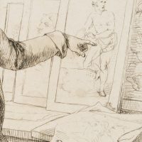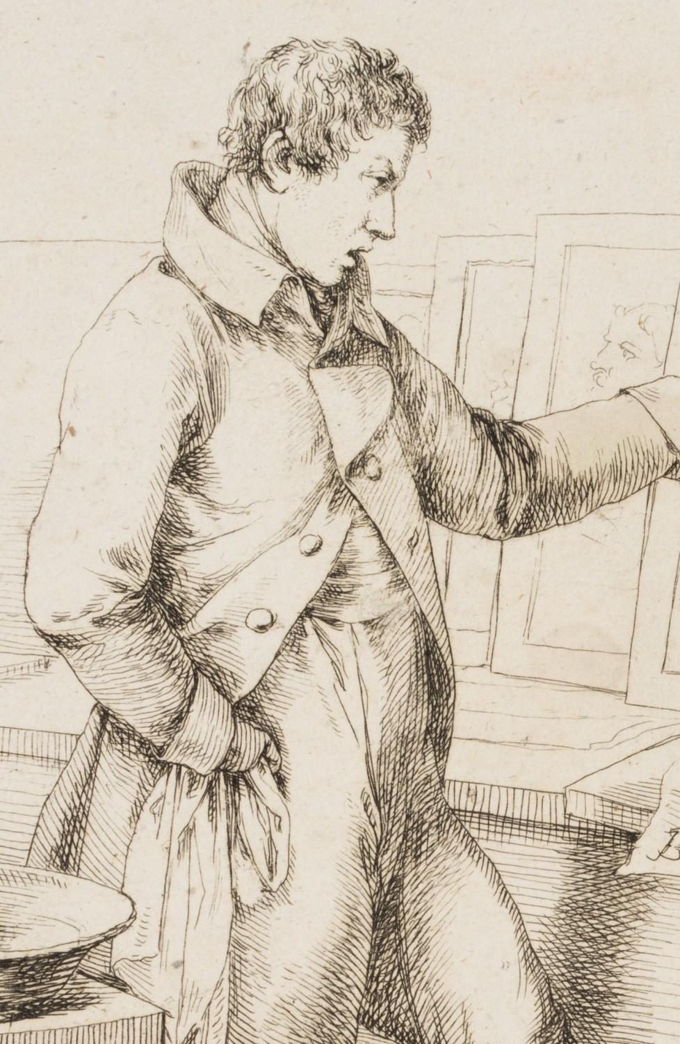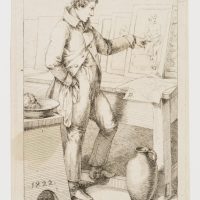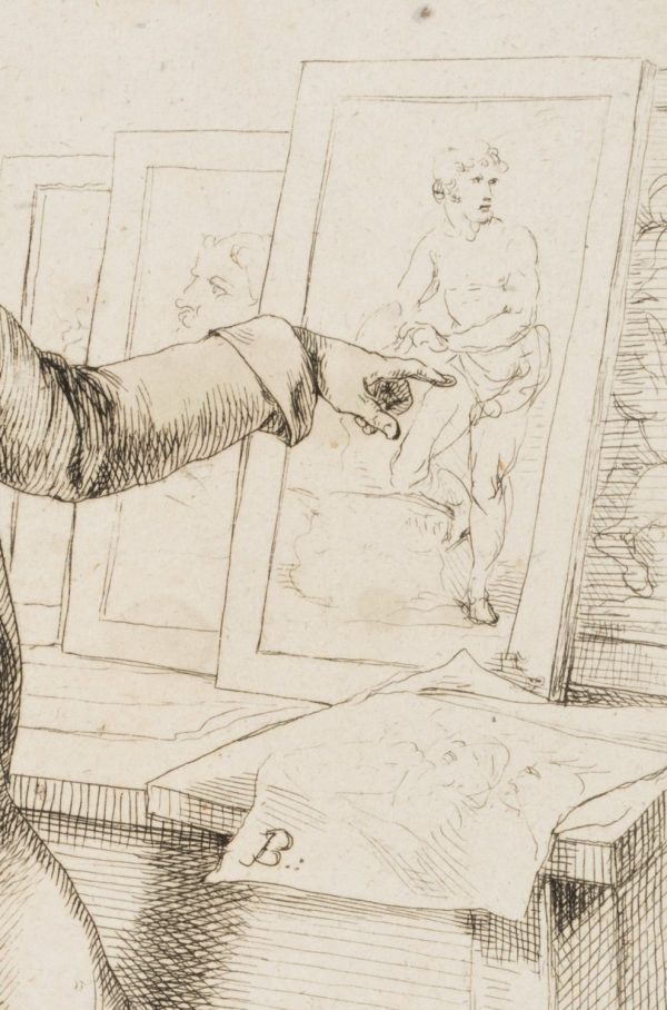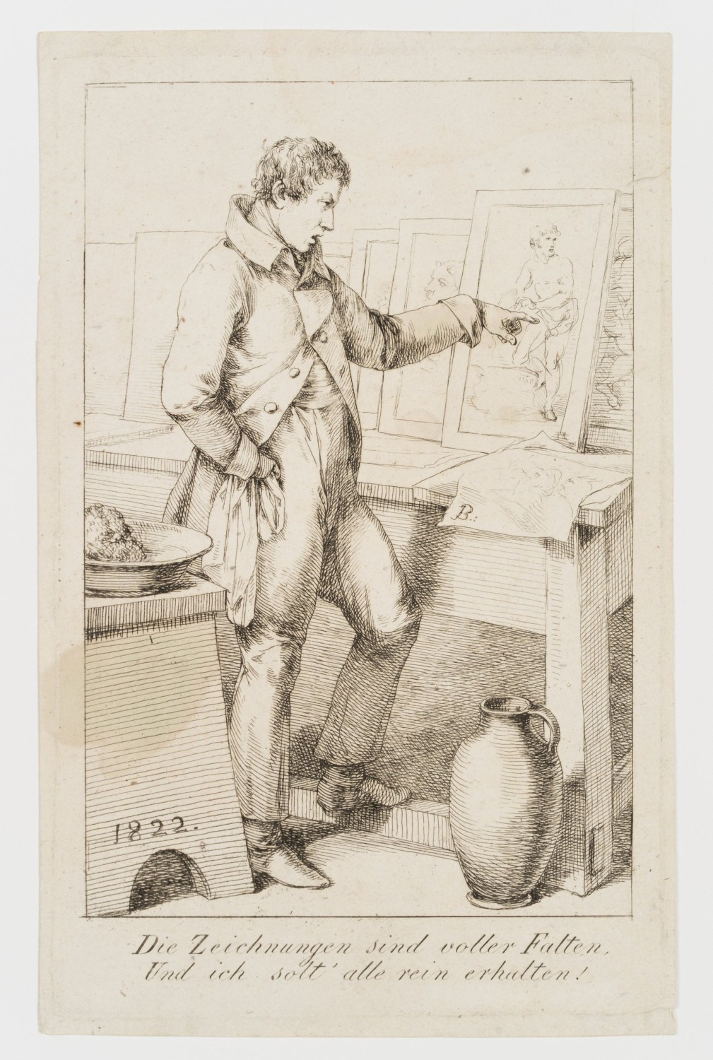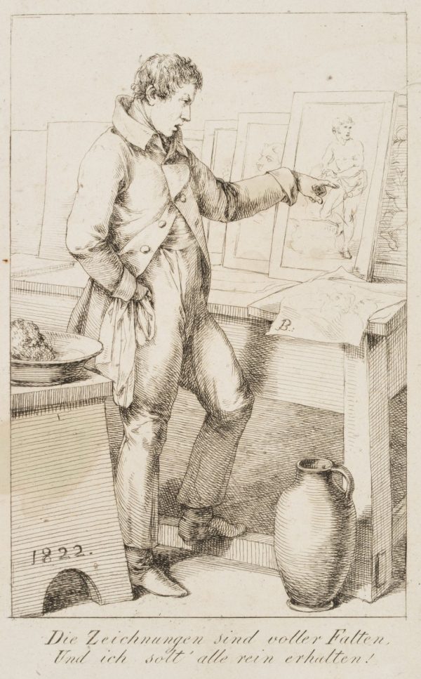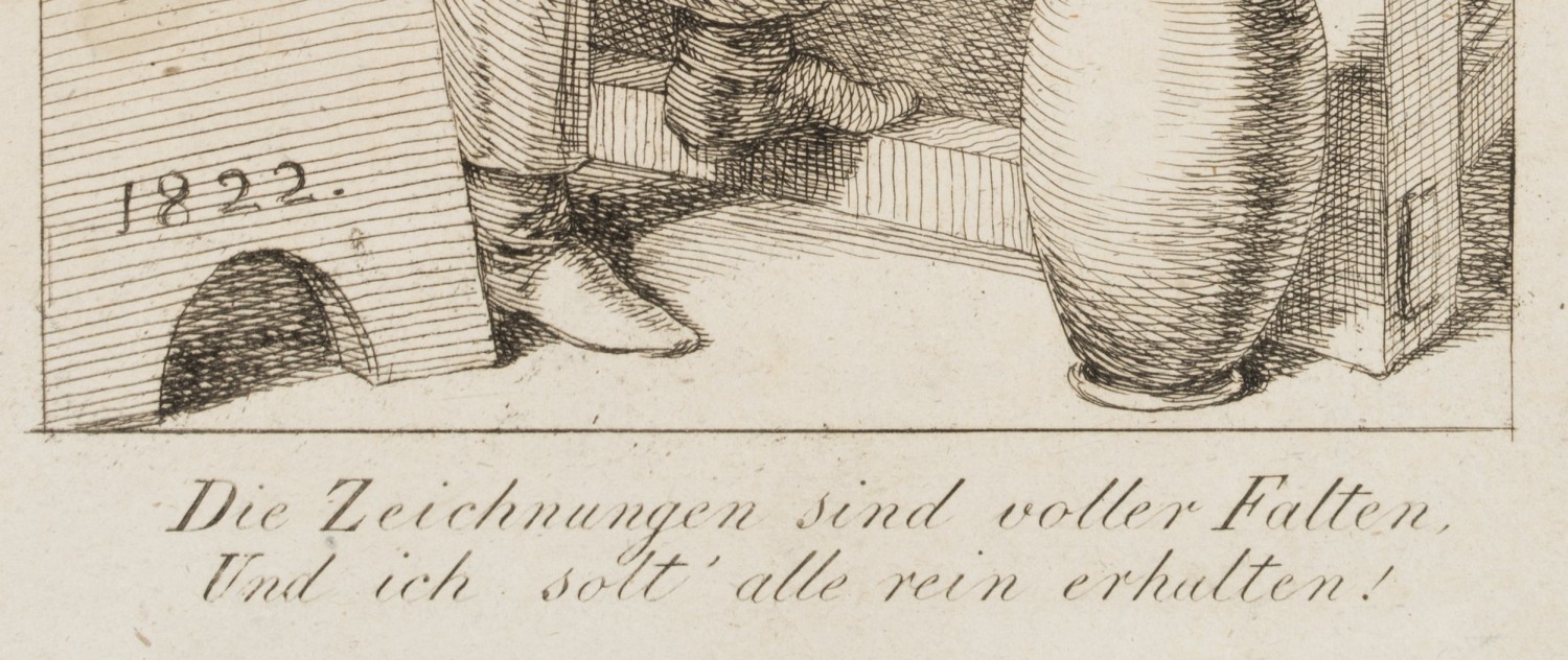 - Inscription: sig “B.:” in the centre right of the printing plate, dated “1822” in the lower left, inscribed below the image: “The drawings are full of folds, and I should keep them all pure!”