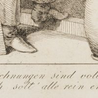 - Bezeichnung: rechts mittig in der Druckplatte sig”B.:”, links unten datiert “1822”, Unterhalb der Darstellung bezeichnet: “Die Zeichnungen sind voller Falten, und ich solt’ alle rein erhalten!”