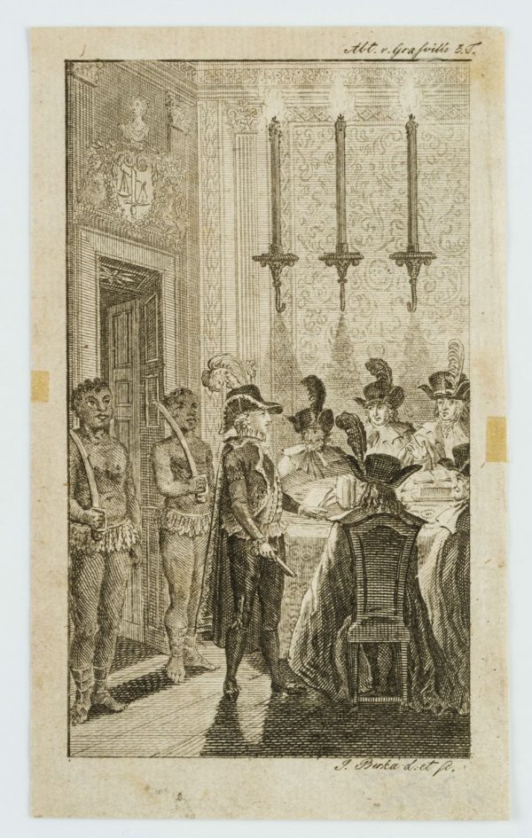 - Beschreibung: Zu einem nächtlichen Zusammentreffen im Schein dreier großer Kerzen erscheint ein prächtig gekleideter Edelmann mit Pistole. Die Tür flankieren zwei dunkelhäutige Eingeborene mit blanken Säbeln. Vermutliuch handelt es sich um eine Verhaftung oder einen gewaltsamen Übergriff in einem frühen Kolonialgebiet.