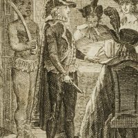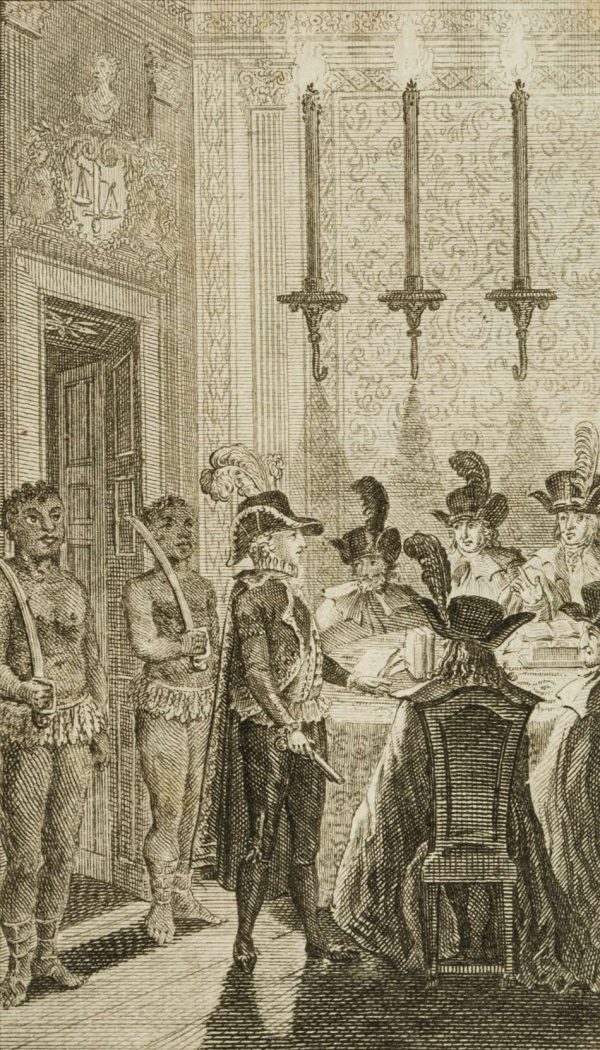 - Description: A splendidly dressed nobleman with a pistol appears at a nightly meeting in the light of three large candles. Flanking the door are two dark-skinned natives with bare sabres. Presumably this is an arrest or a violent attack in an early colonial territory.