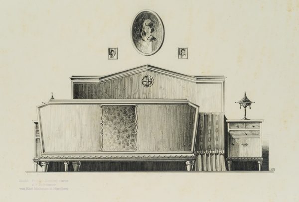 - Beschreibung: Bett mit geschnitzter Kartusche von zwei Nachttischen flankiert. Für das gutbürgerliche Schlafzimmer. Der Entwurf dieser Möbelstücke stammt aus der Zeichenschule von Karl Maibaum. Die Schreiner werden im Entwurfszeichnen von Stilmöbelstücken unterrichtet. Beachten Sie dazu unsere weiteren Angebote aus der Reihe ‘Zeichenschule von Karl Maibaum’.