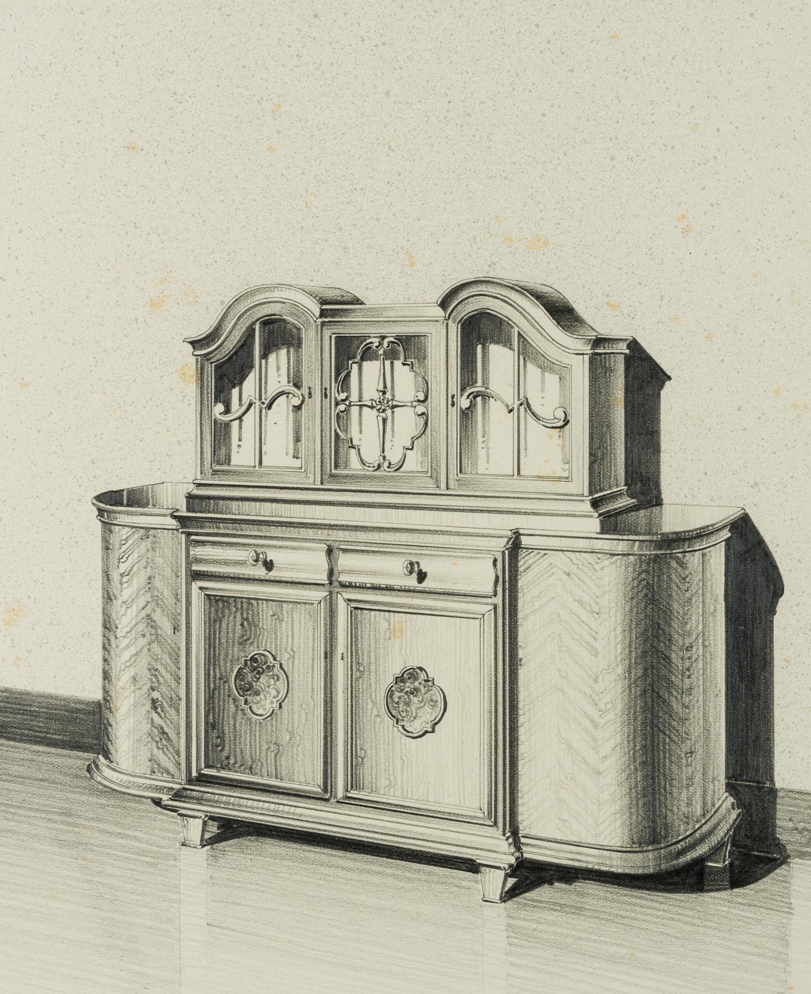 J. Betz (20. Jahrhundert), Historisierende Entwürfe von Stilmöbeln als Übungen für Schreiner. Buffetschrank mit dekorativen Elementen, Kunsthandwerk, 1930er Jahre, , Bleistift