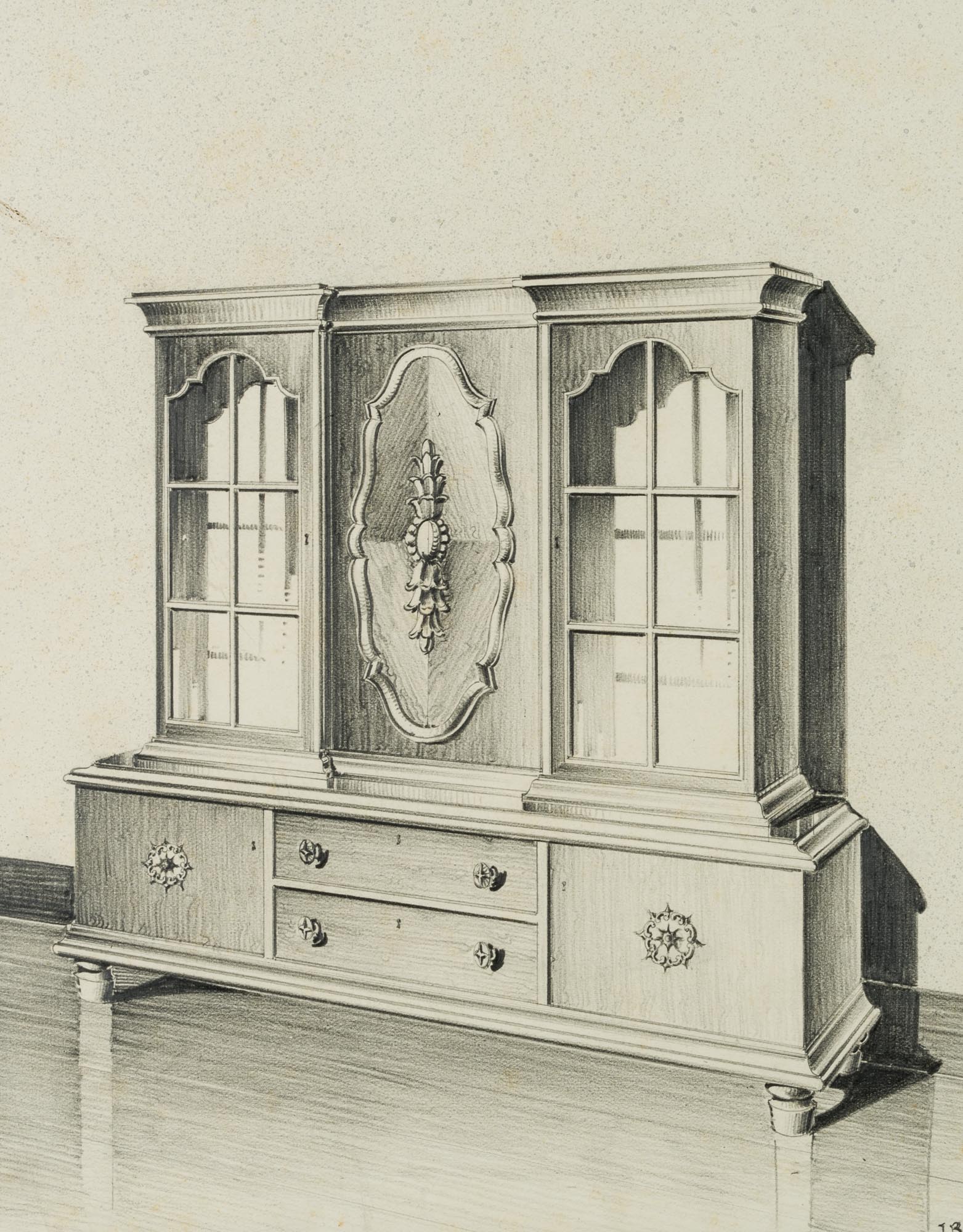 J. Betz (20. Jahrhundert), Historisierende Entwürfe von Stilmöbeln als Übungen für Schreiner. Glasvitrine mit Kartusche, Kunsthandwerk, 1930er Jahre, , Bleistift