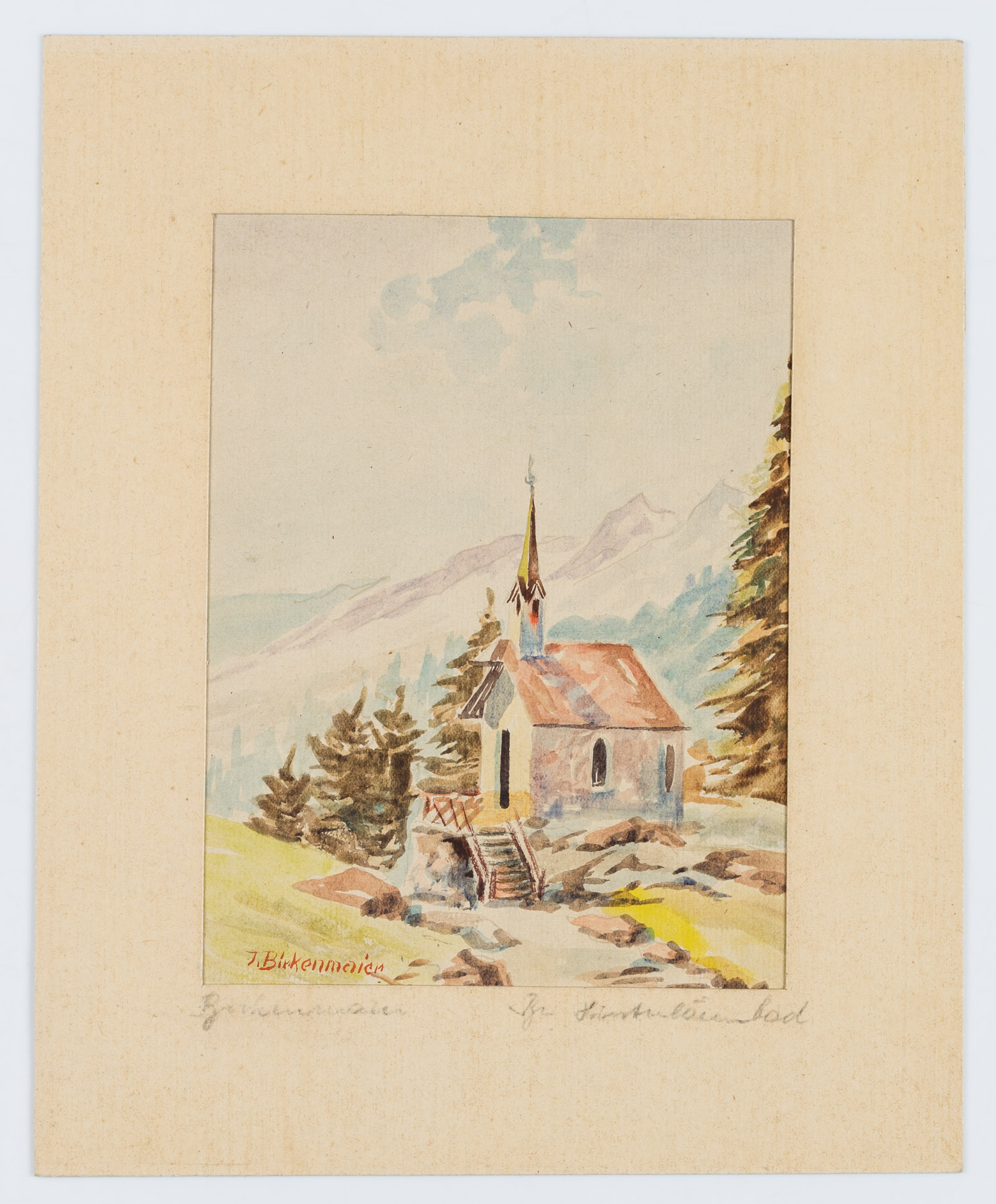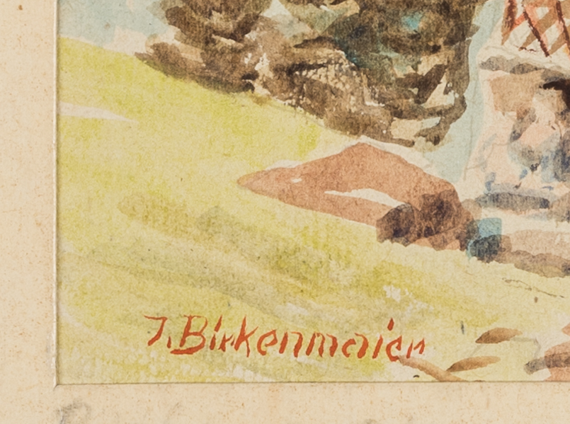 - Bezeichnung: Links unten signiert mit “J. Birkenmaier”. Auf dem Passepartout mit dem Namen des Ortes beschriftet