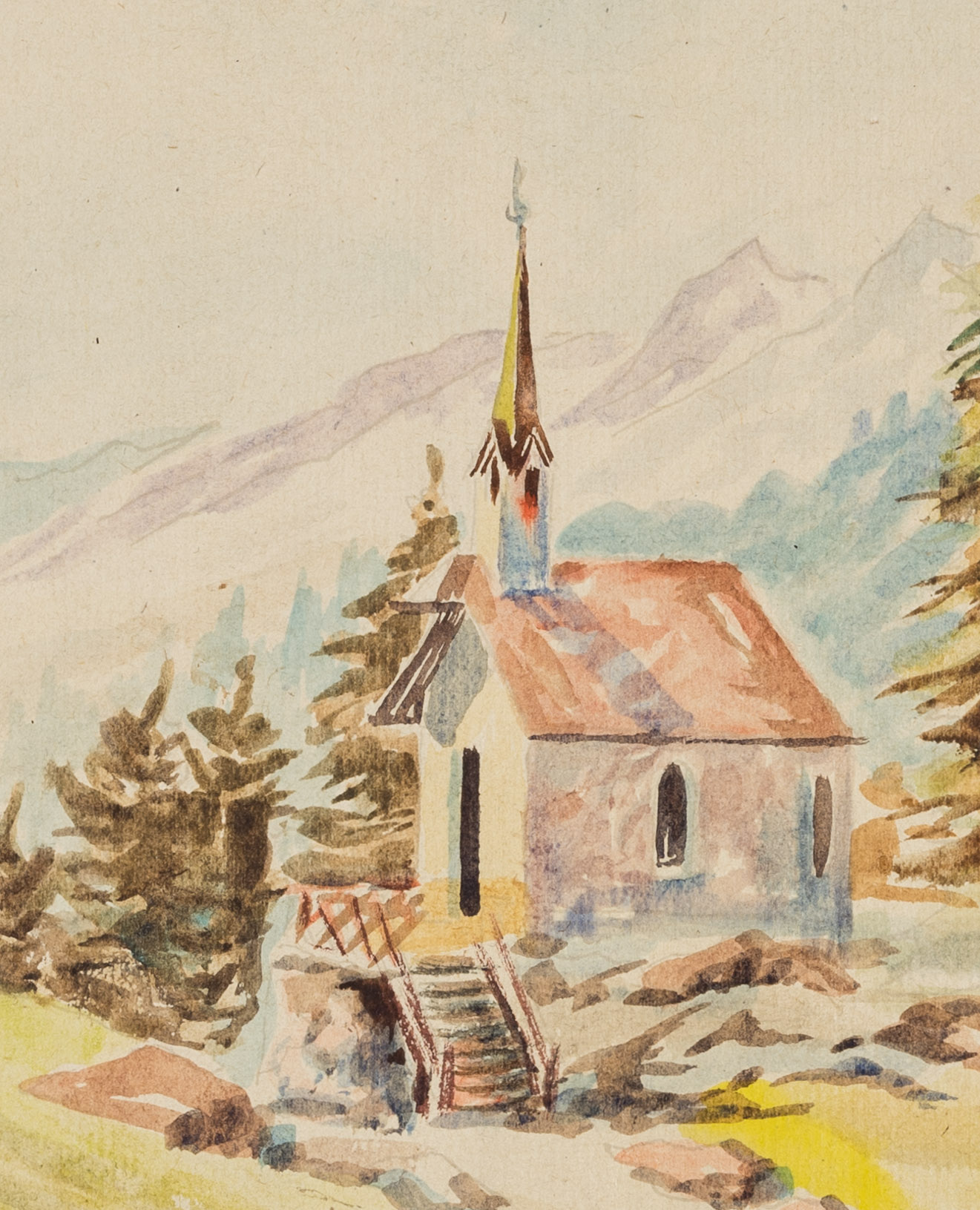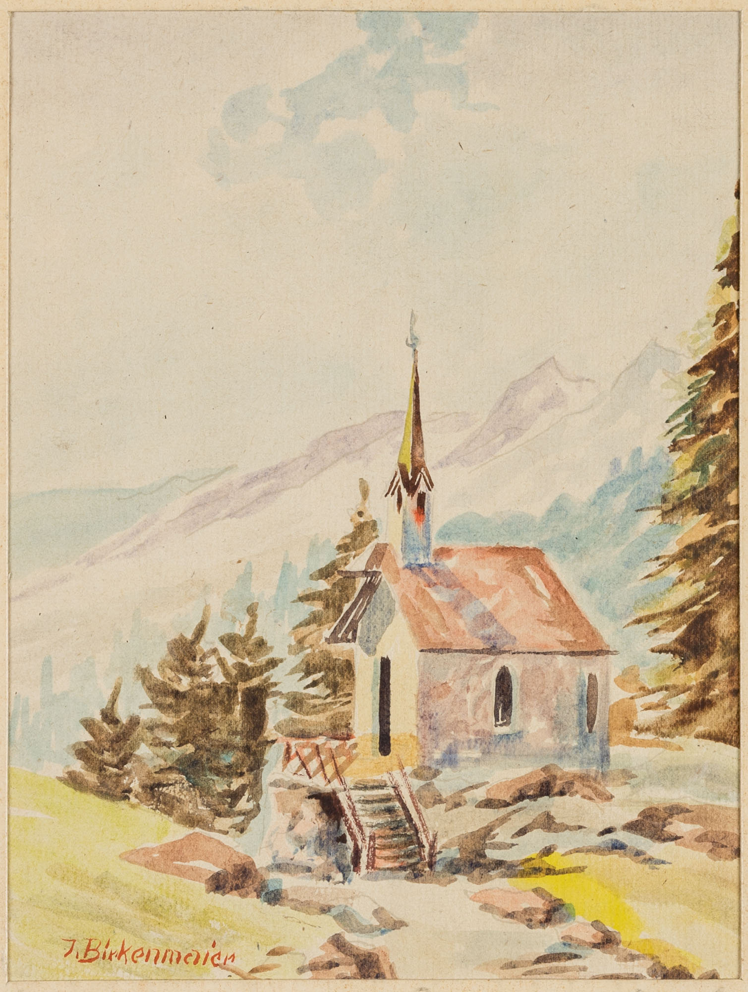 J. Birkenmaier (19. Jahrhundert), Alpenlandschaft. Kapelle vor Gebirgslandschaft. Hinterbärenbad. Anton Karg Haus, 19. Jahrhundert, Aquarell