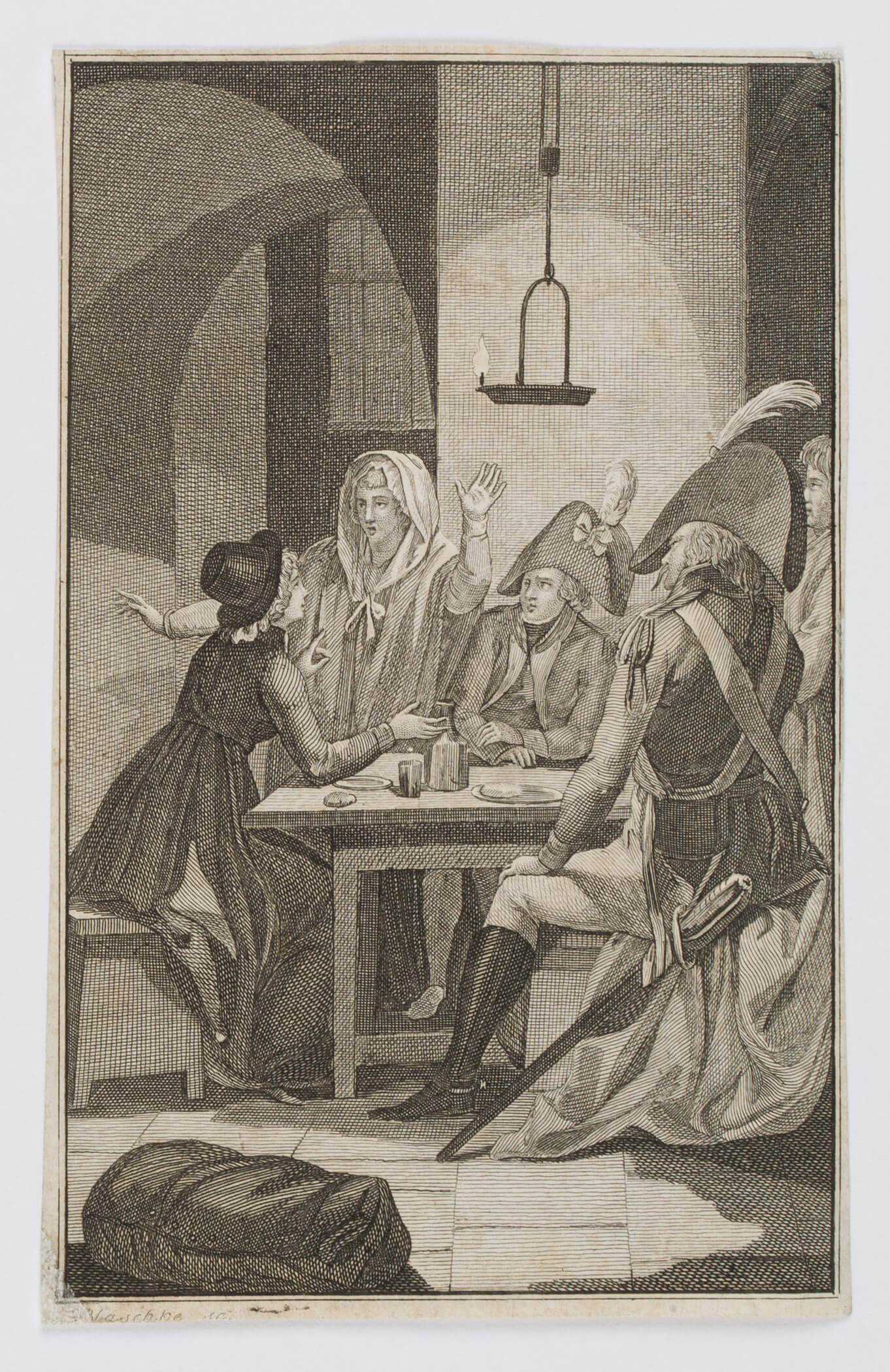 Johann Blaschke (born around 1792 Kotzendorf), Minimalist interior with debating evening round in the light of a candle, c. 1800, Etching