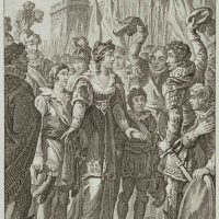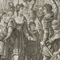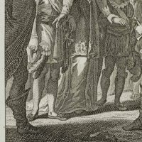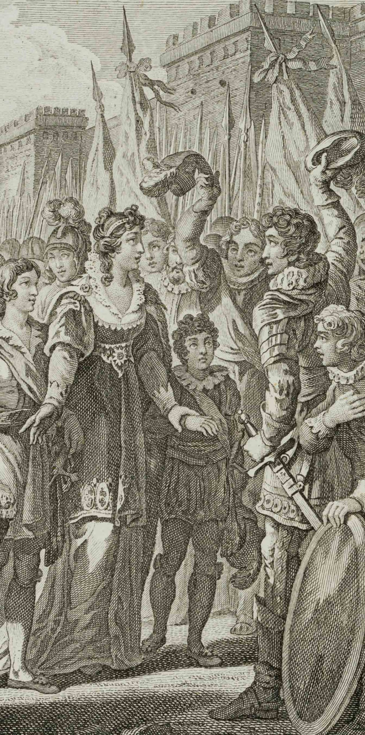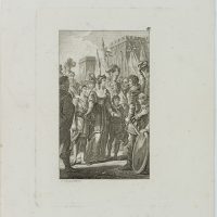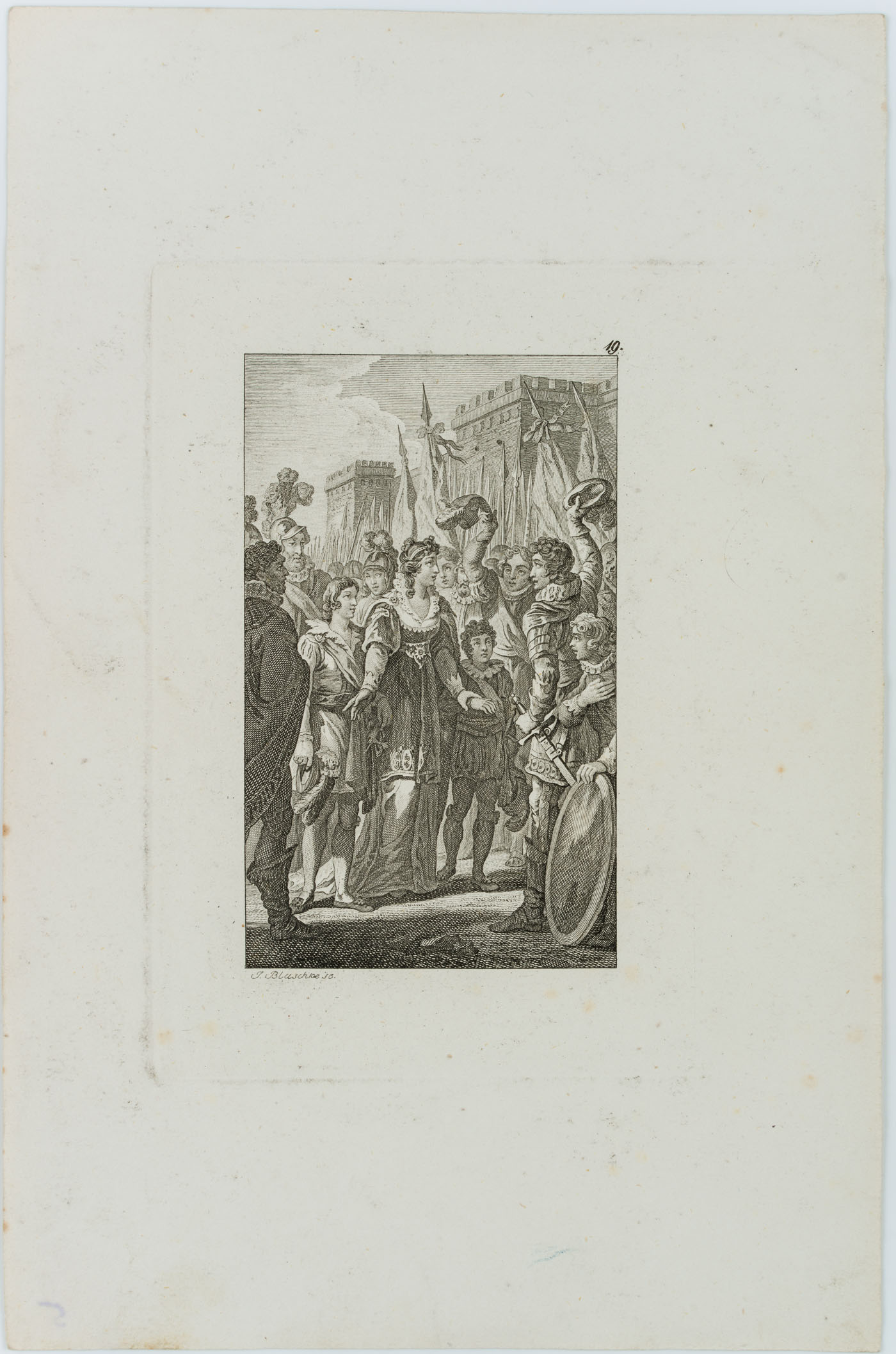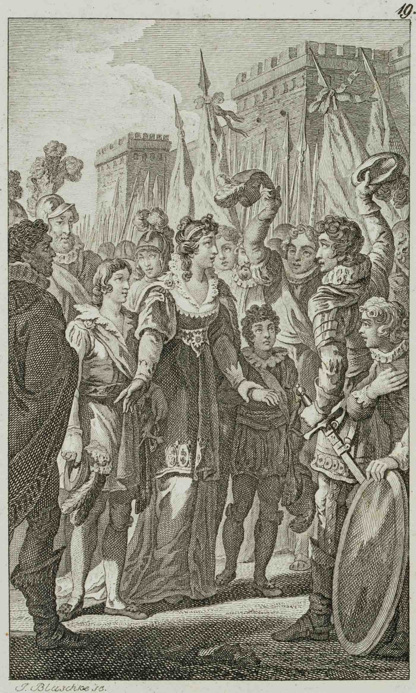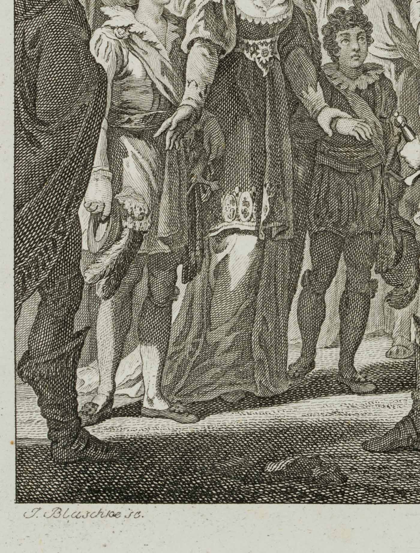- Beschreibung: bezeichnet links unterhalb der Darstellung “J. Blaschke sc.”. Umgeben von einer Menschenmenge erblicken die Betrachtenden im Vordergrund eine junge Frau, zu ihrer Seite zwei junge Knaben. Zwei Männer haben ihre Hüte gezogen, im Hintergrund sind die Lanzen zahlreicher Soldaten zu sehen. Die Darstellung bezieht sich vermutlich auf ein Stück Friedrich SCHILLERS (1759 Marback am Neckar-1805 Weimar).