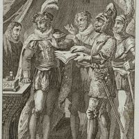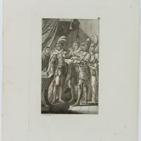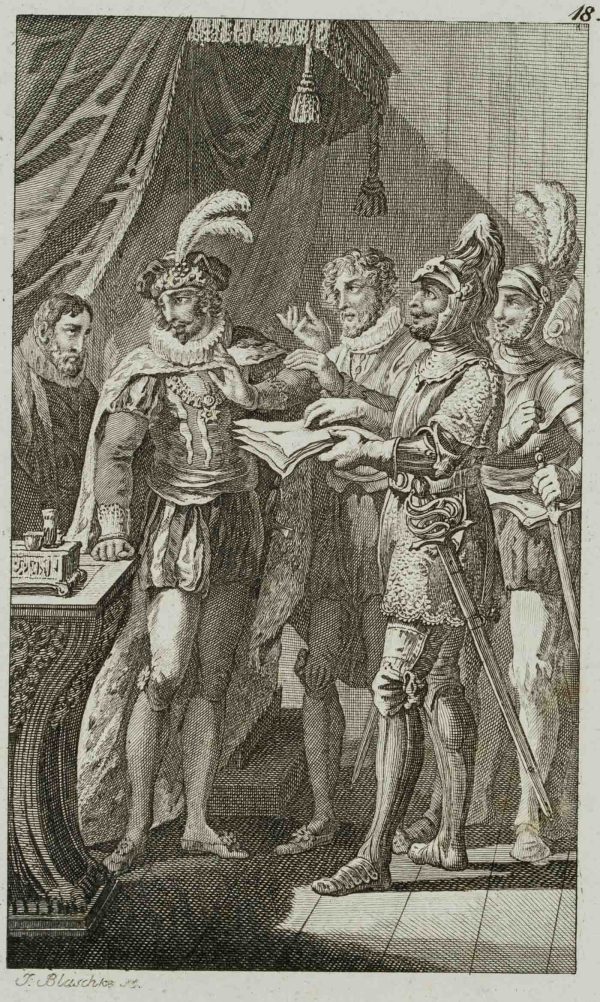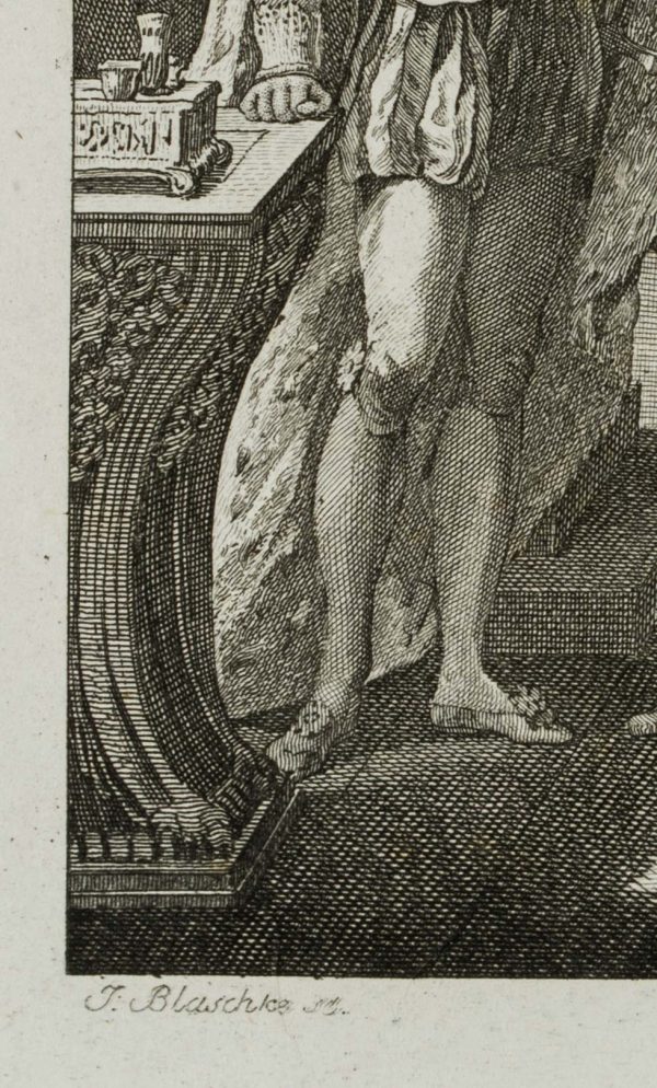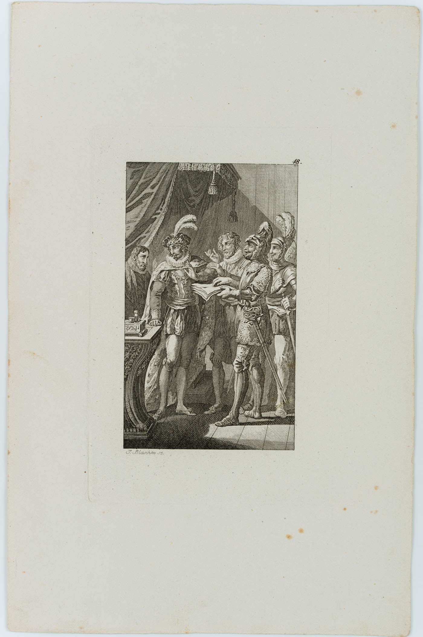 - Description: inscribed on the left below the depiction “J. Blaschke sc.”. In a feudal interior the viewer sees a group of men, partly dressed in noble, partly in military costume. One of the soldiers is handing papers towards a man who seems to be the prince or king. In an absent manner, however, he is looking in the opposite direction. The depiction probably refers to a play by Friedrich SCHILLER (1759 Marback am Neckar-1805 Weimar).