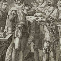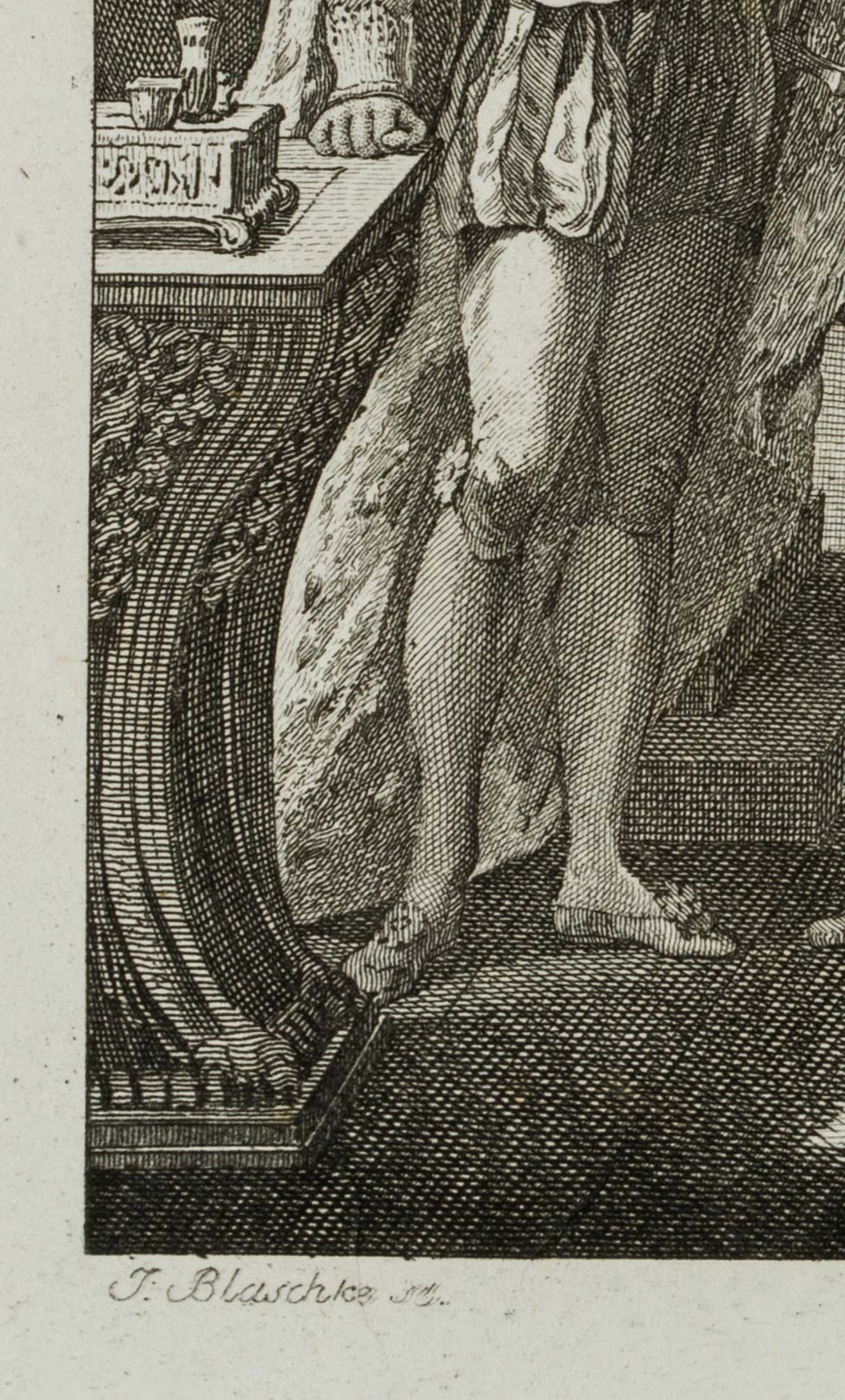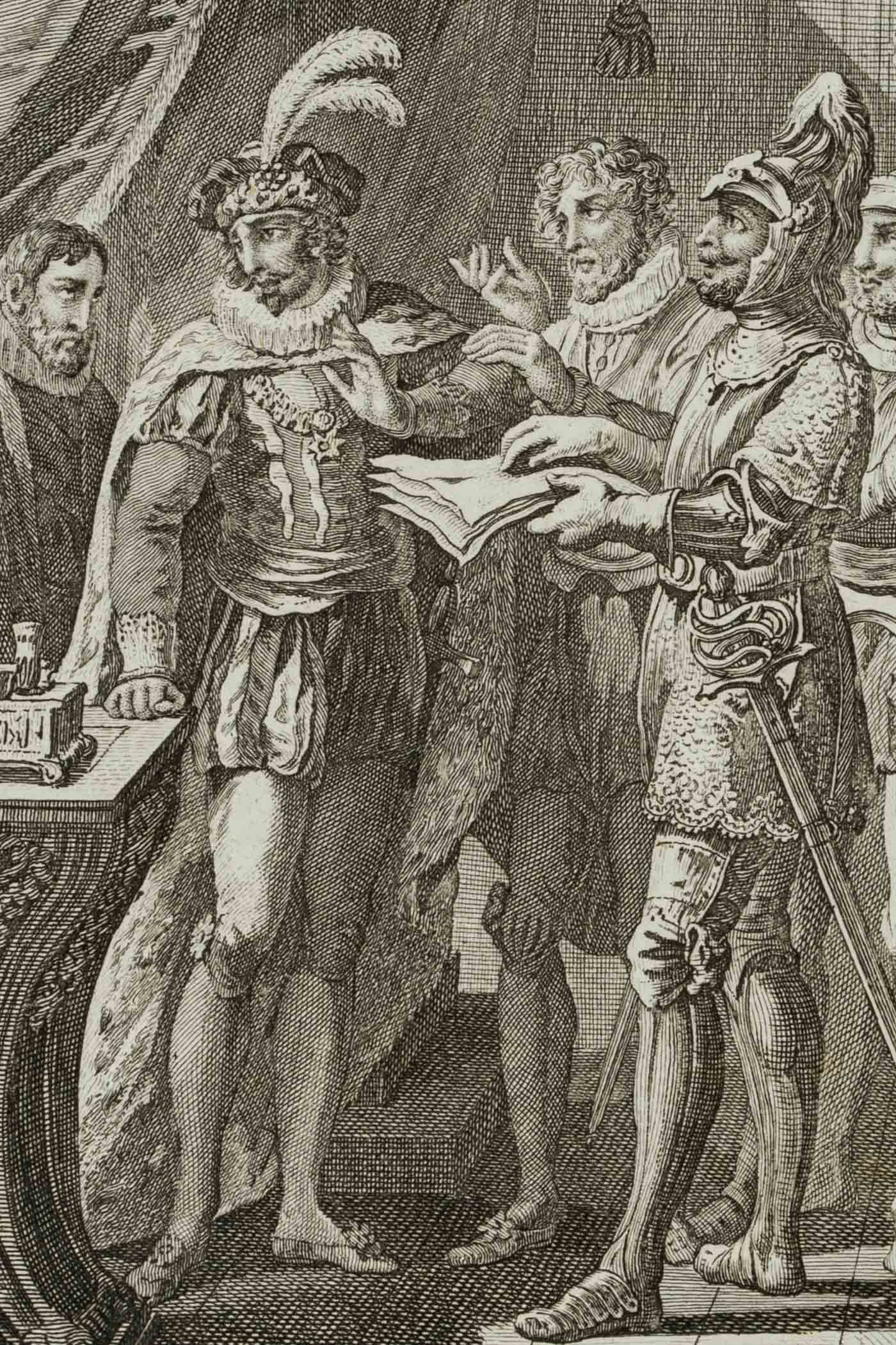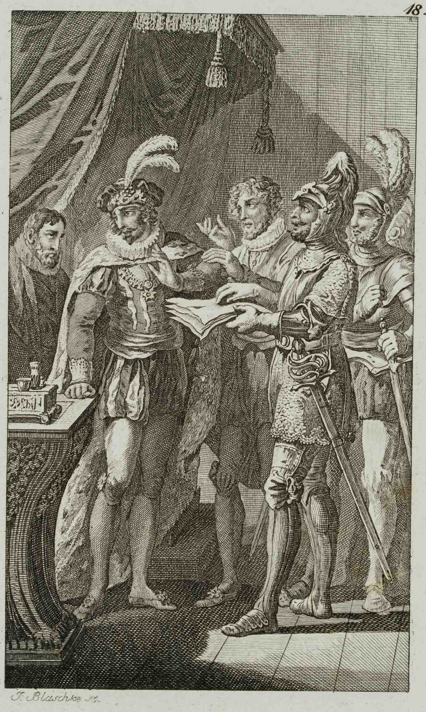 - Beschreibung: bezeichnet links unterhalb der Darstellung “J. Blaschke sc.”. In einem feudalen Innenraum erblicken die Betrachtenden eine Gruppe von Männern, teils in vornehme, teils in militärische Tracht gekleidet. Einer der Soldaten reicht Schriftstücke in Richtung eines Mannes, der wohl der Fürst oder König zu sein scheint. In abwesender Manier blickt er jedoch in die entgegengesetzte Richtung. Die Darstellung bezieht sich vermutlich auf ein Stück Friedrich SCHILLERS (1759 Marback am Neckar-1805 Weimar).