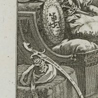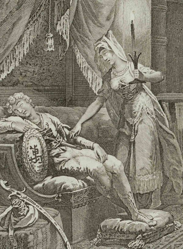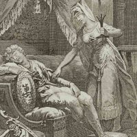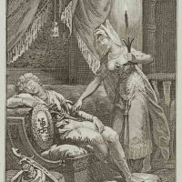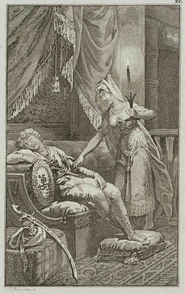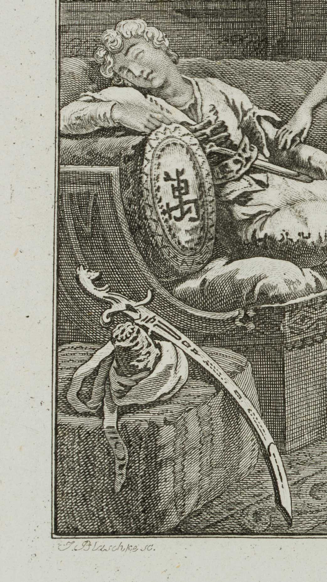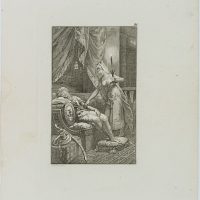 - Beschreibung: bezeichnet links unterhalb der Darstellung “J. Blaschke sc.”. In einem feudalen Innenraum, auf einer Chaiselongue sitzend, ist ein Jüngling mit geschlossenen Augen zu sehen. Er schläft fest, scheint wie tot, so suggeriert es die junge Frau, die an seine Seite getreten ist und in Sorge seinen Arm berührt. Die Darstellung bezieht sich vermutlich auf ein Stück Friedrich SCHILLERS (1759 Marback am Neckar-1805 Weimar).