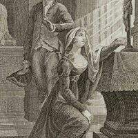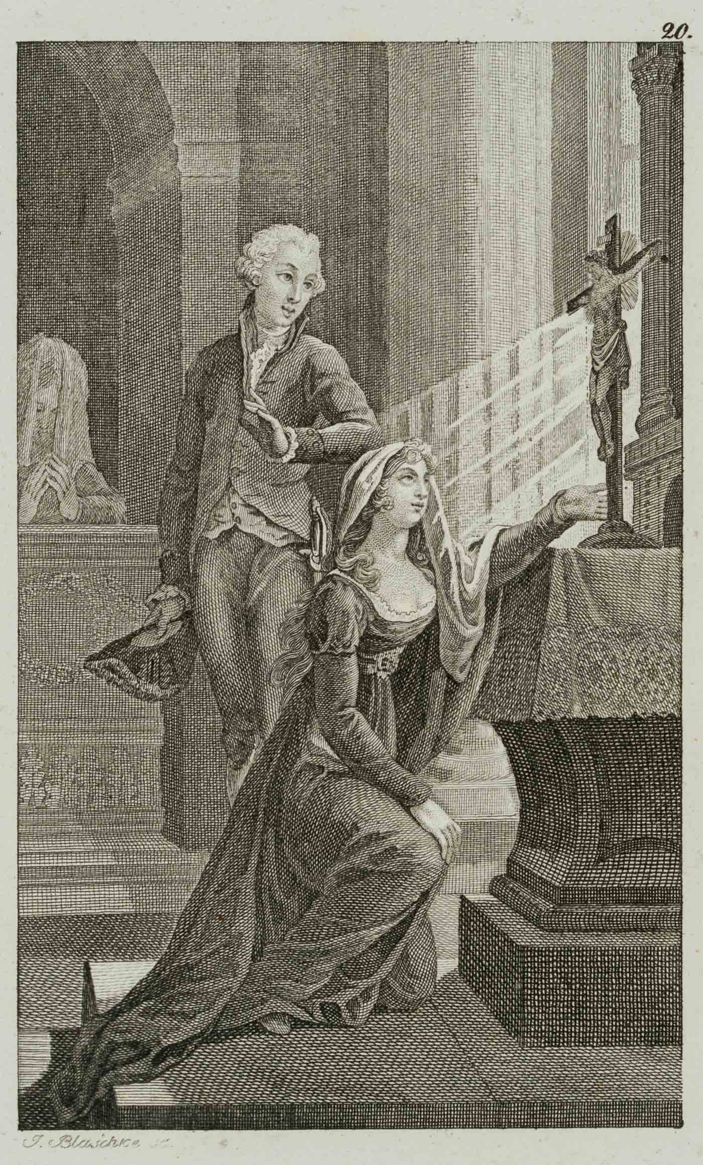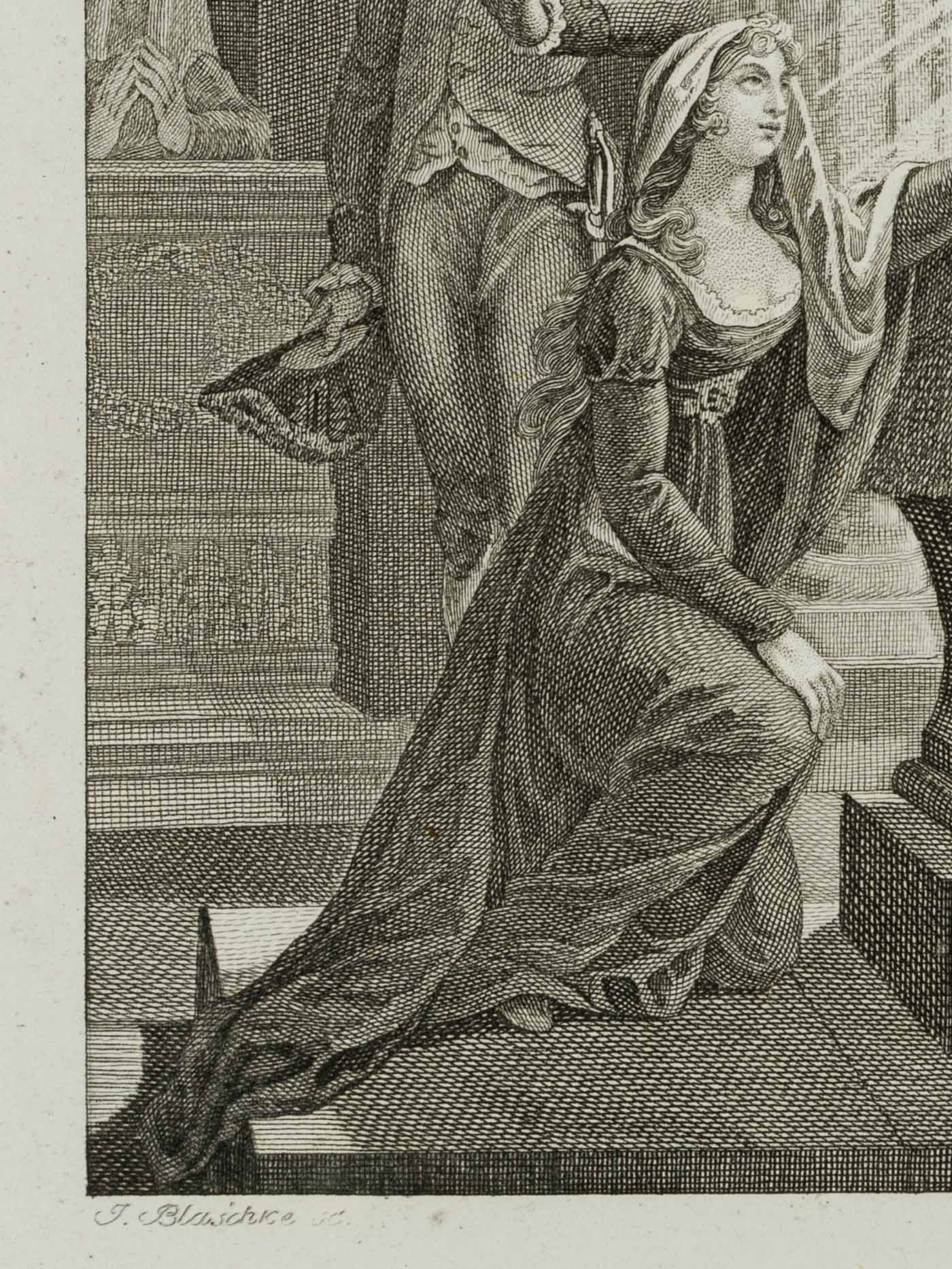 - Beschreibung: bezeichnet links unterhalb der Darstellung “J. Blaschke sc.”. Szene aus dem Drama “Der Geisterseheer” von Friedrich SCHILLER. Darin beschreibt SCHILLER die Intrige einer jesuitischen Geheimgesellschaft, die einen protestantischen Prinzen zum Katholizismus bekehren und ihm zugleich die Krone in seinem Stammland sichern will, um dort die eigene Machtbasis auszubauen. Am Schicksal des Prinzen verdeutlicht SCHILLER den für ihn zentralen Konflikt zwischen Leidenschaft und Sittlichkeit, Neigung und Pflicht.