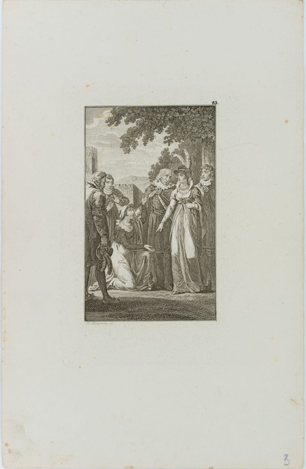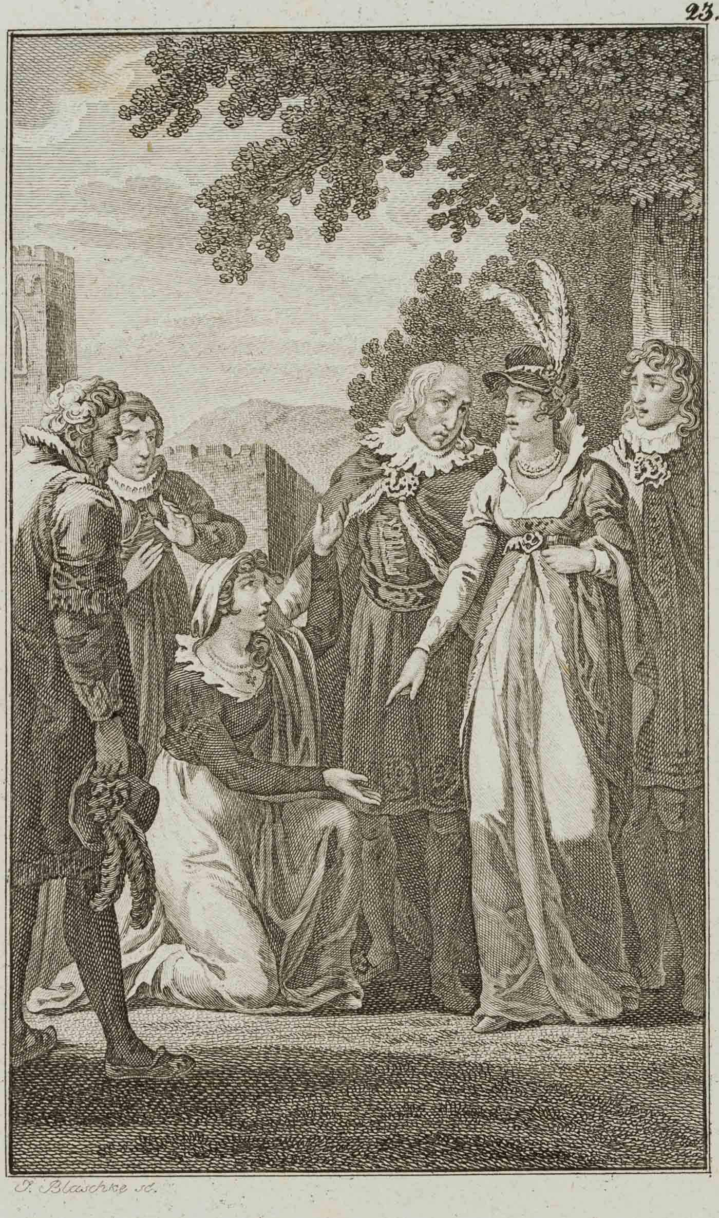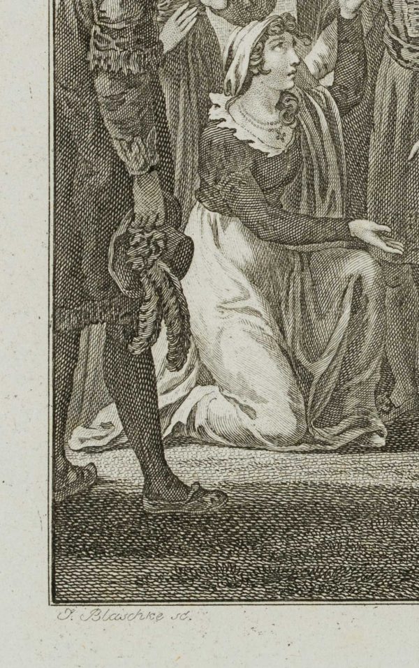 - Beschreibung: bezeichnet links unterhalb der Darstellung “J. Blaschke sc.”. Szene aus “Maria Stuart”, einem Drama in fünf Akten von Friedrich SCHILLER. Im Jahre 1568 wird Maria Stuart, Königin von Schottland, wegen des Verdachtes auf Beihilfe bei der Ermordung ihres Gatten aus dem Land verjagt und flieht nach England. Sie erhofft sich Schutz bei Elisabeth I., der englischen Königin. Die aber muss um ihre Krone fürchten, da Maria selbst Ansprüche darauf hat. Deshalb lässt Elisabeth sie gefangen nehmen und in einem Schloss internieren. Im dritten Aufzug der Handlung begegnen sich Maria und Elisabeth wie zufällig im Garten vor dem Gefängnis. Während Maria zunächst um Gnade bittet, wie in der Darstellung gezeigt, deklassiert sie Elisabeth kurz darauf. Ihr Schicksal ist damit besiegelt.
