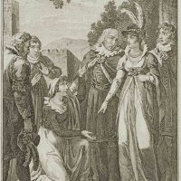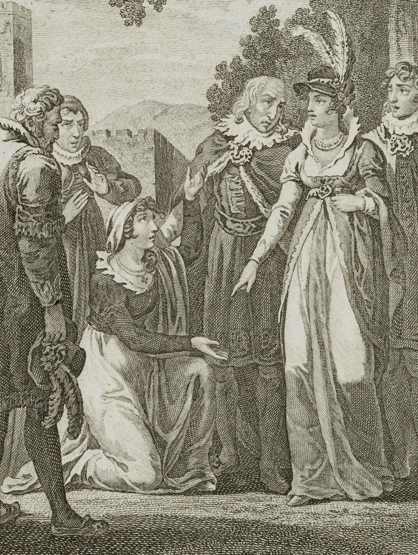- Description: inscribed on the left below the depiction “J. Blaschke sc.”. Scene from “Mary Stuart”, a drama in five acts by Friedrich SCHILLER. In 1568 Mary Stuart, Queen of Scotland, is chased out of the country on suspicion of aiding in the murder of her husband and flees to England. She hopes for protection from Elizabeth I, the Queen of England. But she must fear for her crown, as Mary herself has claims to it. For this reason, Elizabeth has her taken prisoner and interned in a castle. In the third act of the plot, Mary and Elizabeth meet as if by chance in the garden outside the prison. While Mary initially begs for mercy, as shown in the depiction, she declassifies Elizabeth shortly afterwards. Her fate is thus sealed.