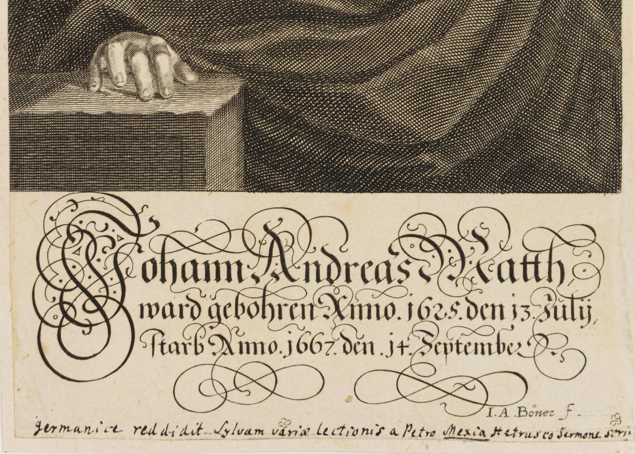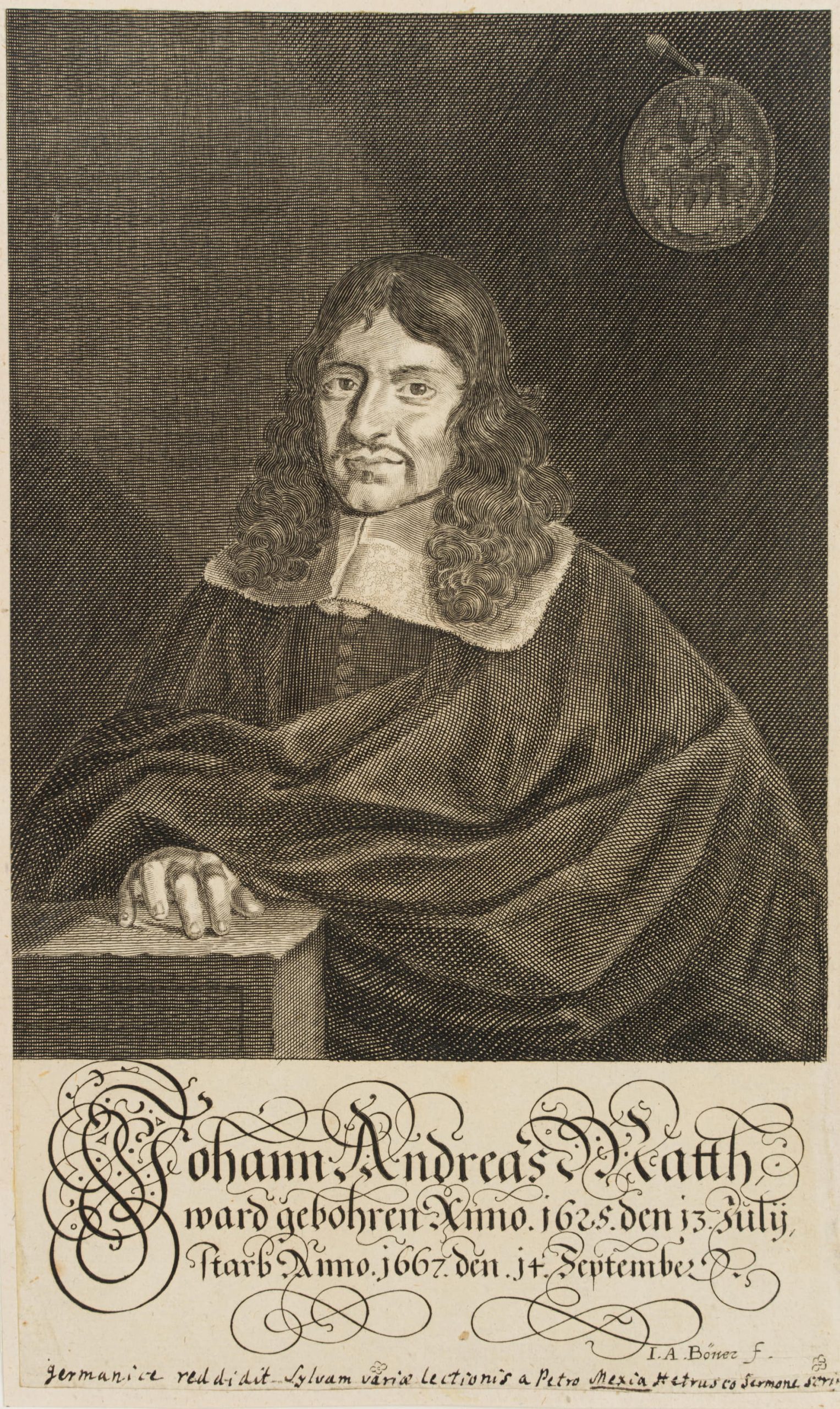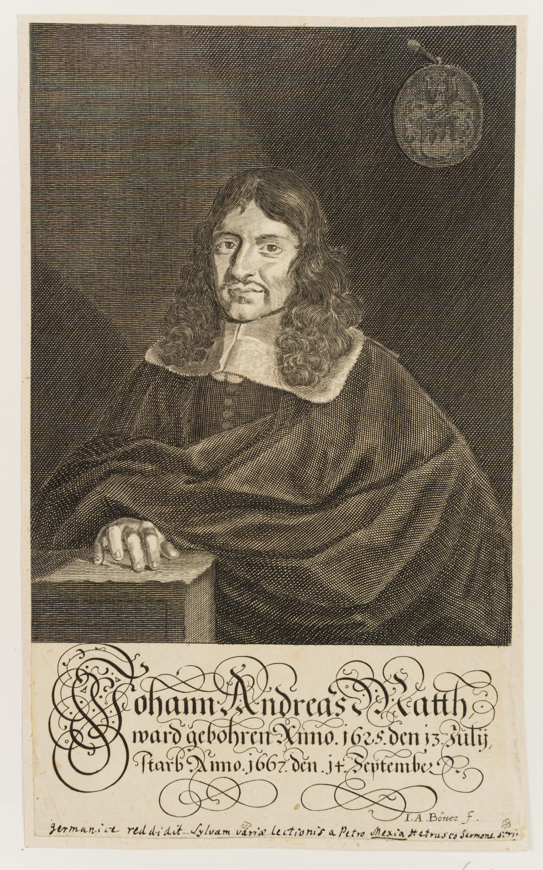 - Inscription: Lower right signed in the printing plate: “I. A. Börner f.”. Lower middle inscribed in the printing plate: “Johann Andreas Matth ward gebohren Anno 1625 den 13. Julÿ, starb Anno 1667 den 14. September”.