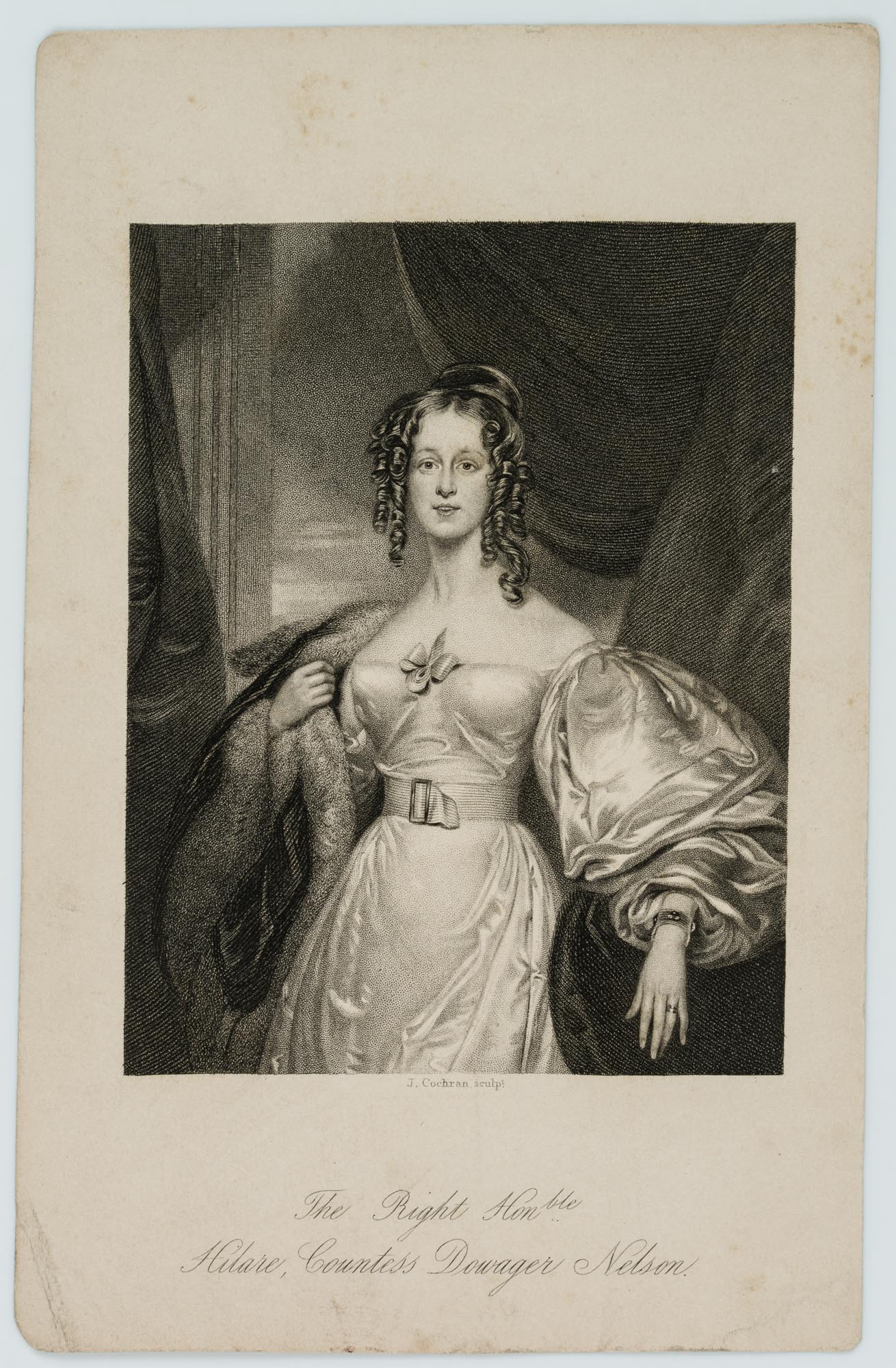 - Description: Inscribed with title and production note centrally below the image: ‘J. Cochran sculp.t’. Portrait Hilare Duchess of Nelson with beautiful curls and striking dress; after George Lethbridge Saunders.