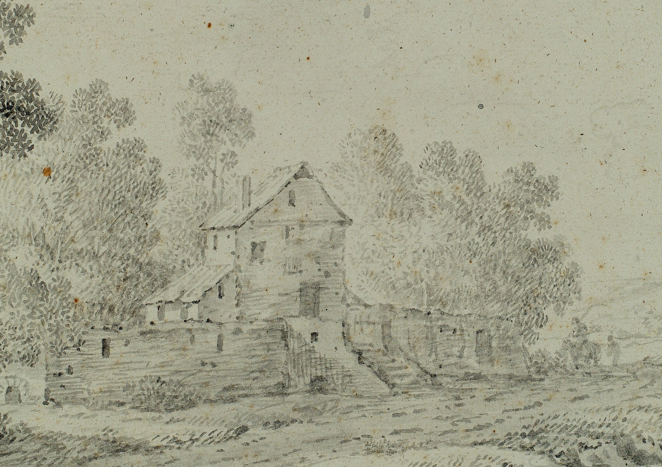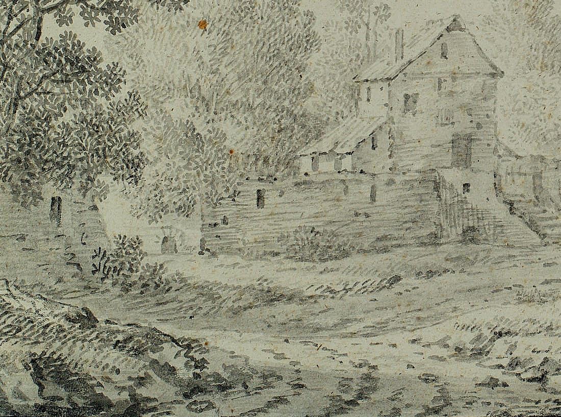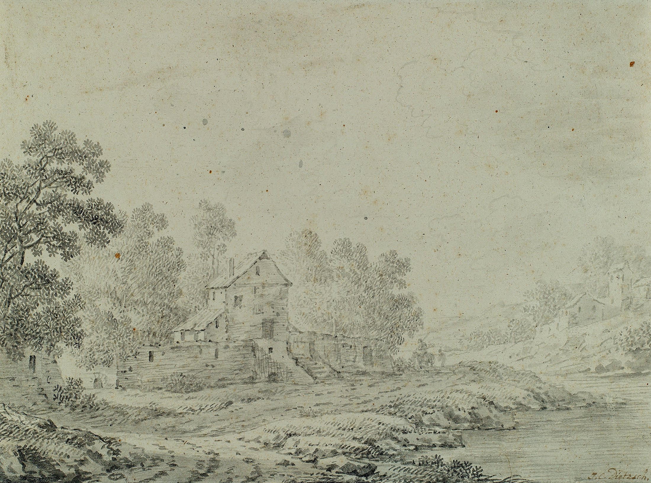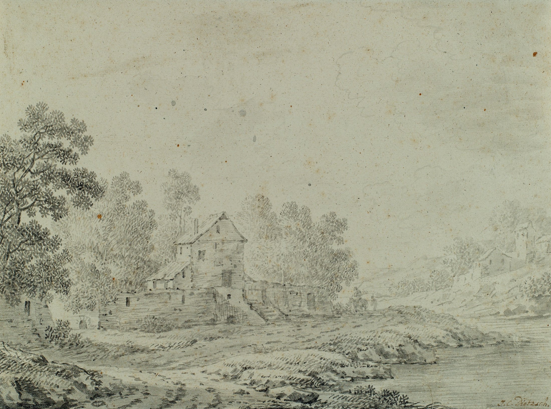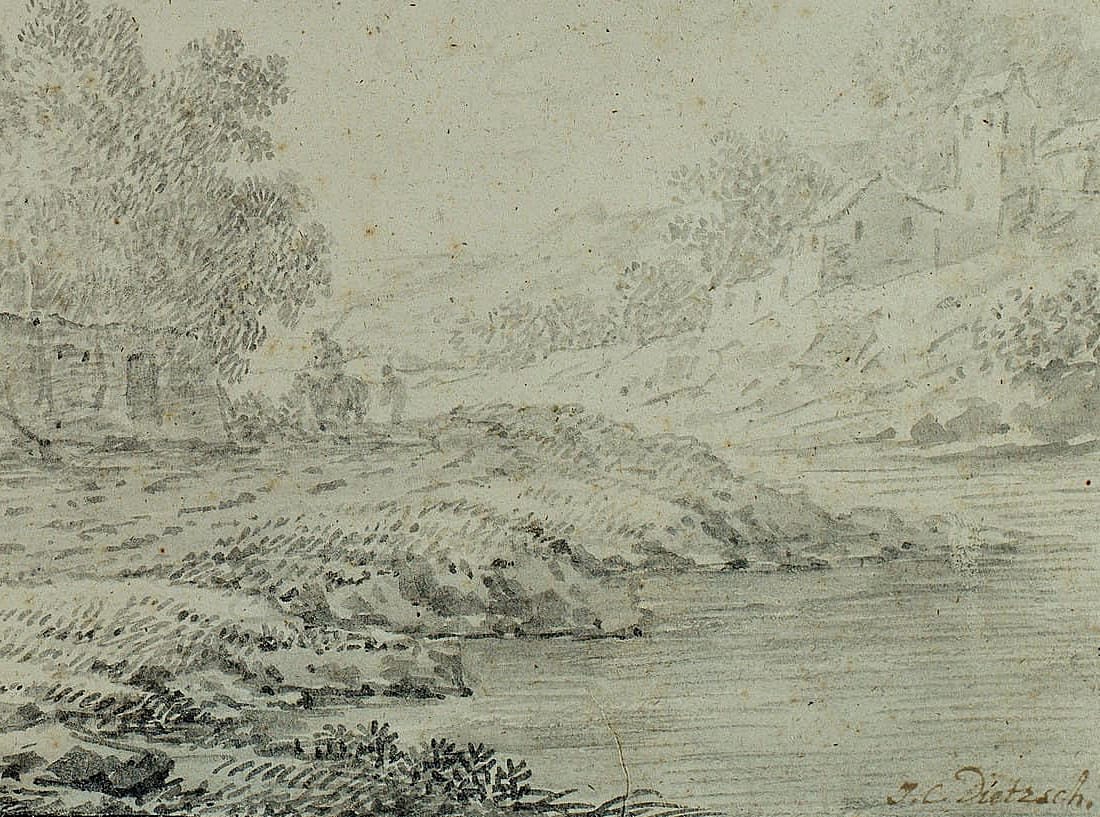 - Description: With flower and fruit pieces, kitchen still lifes, but above all with small, poetically presented landscapes, Dietzsch, the second eldest and most successful son of a large family of artists, supplied a steadily growing art market that was not limited to Germany alone but also extended to England and the Netherlands. Especially bourgeois and aristocratic collectors with private cabinets took a liking to the artist’s delicately executed, pictorial drawings and prints. Dietzsch’s influences were complex and included Dutch painting as well as the landscapes of the painters Willem van Bemmel and Johann Franz Ermels, who had worked in Nuremberg a generation earlier, and the current emerging interest in travel sketches and picturesque views. A fine example of these “Plaisant Prospekte”, as Dietzsch called a series of landscapes created in 1737, is the present ink drawing: a winding building lying by the river, backed by tall trees. Moved slightly out of the centre of the page to avoid a static impression, the house lies on the other side of a path along the river. The water and path are also moving, curving and lively, linking the detailed and darker foreground with the bright, softly washed distance under the high sky. Dietzsch’s extensive knowledge of composition and colour rules is palpable. Especially in Nuremberg, where Sandrart founded the first German academy in 1662 and published the “Teutsche Akademie” (German Academy) in 1675, the first art theory in the German language, the artistic canon of rules formed an unbreakable basis for every painter and draughtsman. Yet Dietzsch escapes the danger of pedantry. He masters his graphic grammar so confidently that he combines the clear structure, the staggering of the pictorial spaces, the brightening of the background and the well-placed small group of staffage to the right of the centre to create an entirely unacademic impression that has a natural grace. Dietzsch’s observation of nature and his tree strokes were already praised by contemporaries. Thanks to Dietzsch’s distinct feeling for the mood of the scene, this meticulousness in detail does not lead to the isolation of details. In addition, his stroke is always animated, remains light even in darker areas and sometimes – for example, in the area of the figures with the horse – only hints at motifs without making them fully recognisable. It is the talent for the atmospheric, so skilfully presented here, which has earned his landscapes great admiration. | Watermark: undeutlich