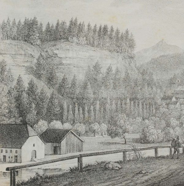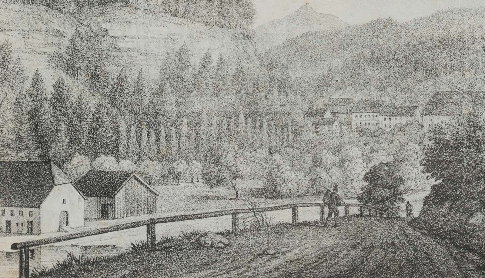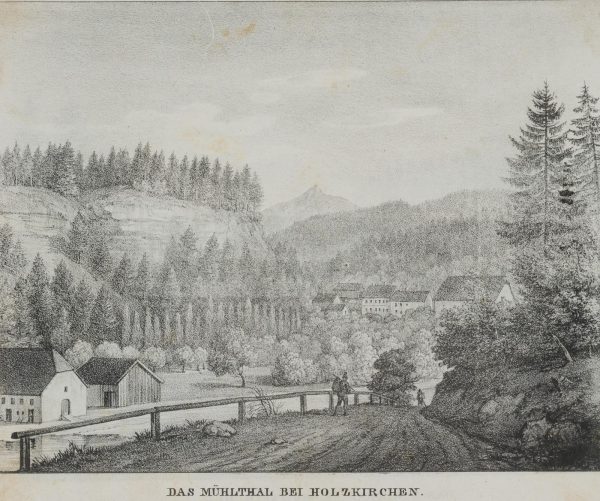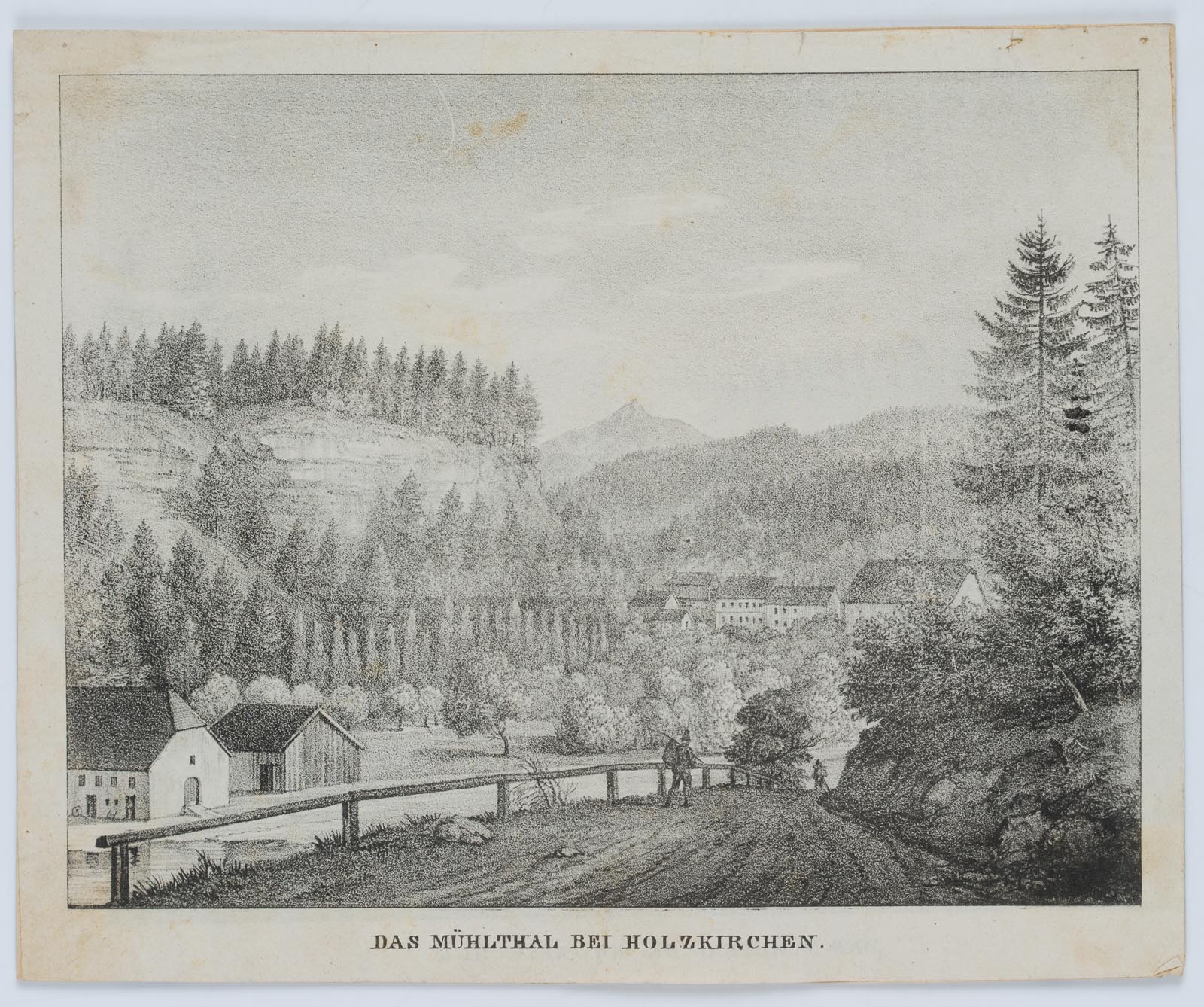 Johann Baptist Dilger (1814 München – 1847 ebd.), Das Mühlthal bei Holzkirchen. Blick von einem Wanderweg auf das Tal mit kleiner Ortschaft, 1837, Lithographie