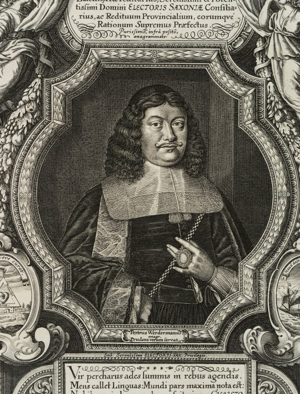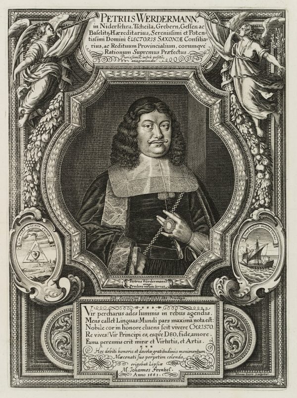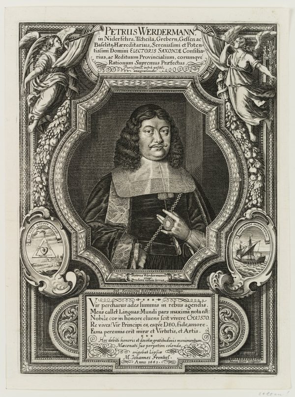 - Beschreibung: Das Porträt zeigt den Rat des Kurfürsten von Sachsen Johann Georg II, Petrus Werderman. Der Stich beeindruckt durch das nüchterne Proträt in Dreiviertelansicht des Dargestellten, dessen Würde im Porträt selbst lediglich durch das Halten eines Ordens mit der linken Hand betont wird. Im Kontrast dazu der sehr ausbordende, mit prazise gestochenen figürlichen Elementen und bildlichen Darstellungen versehene Schmuckrahmen.