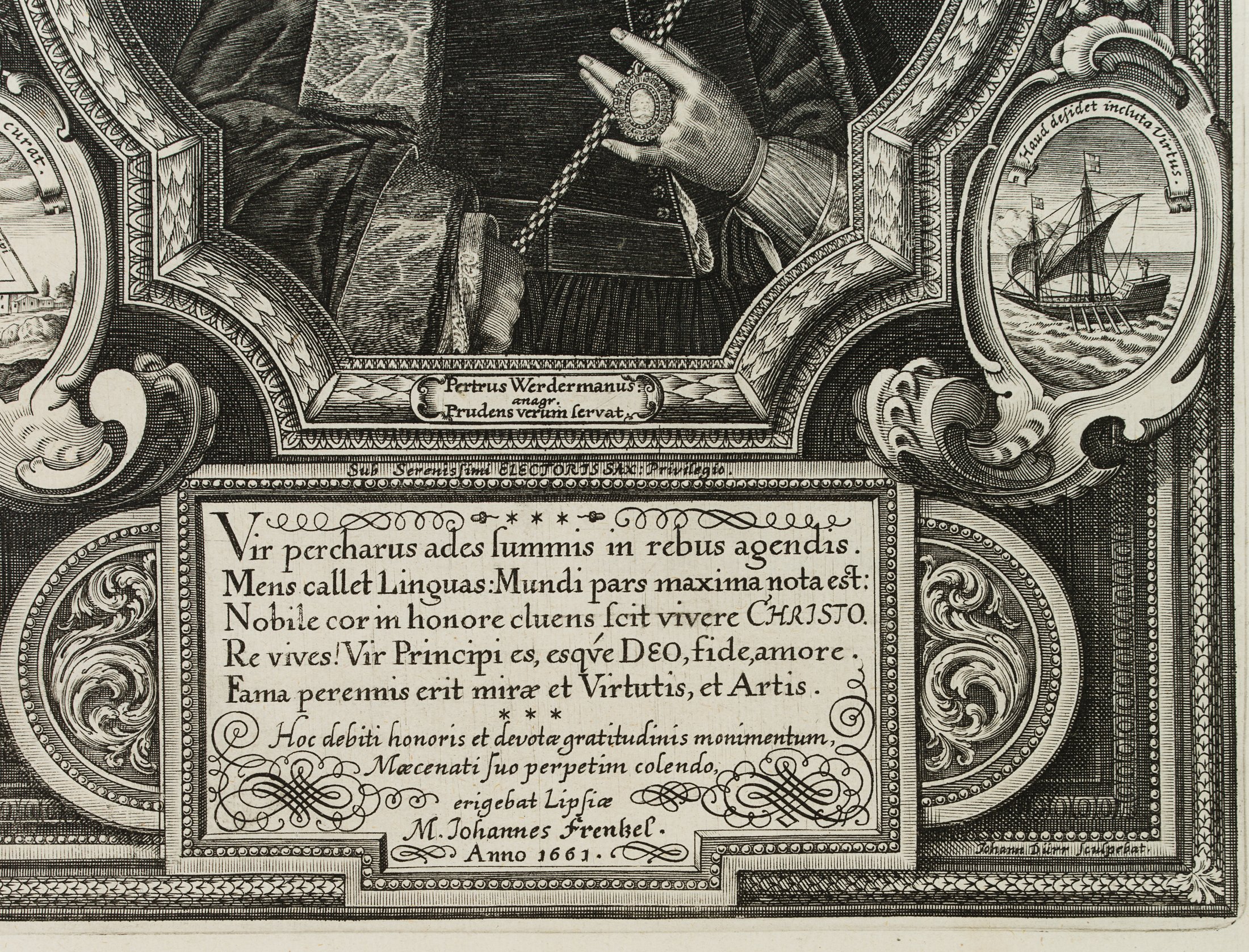 - Inscription: Lower right signed in the printing plate: “Johann Dürr sculpebat.”. Inscribed in the printing plate: “Inschrift über dem Dargestellten: “PETRUS WERDERMANN, in Niderfehra, Ticheila, Grebern, Gessen ac Baselitz, Haereditarius, Serenissimi et Poten=/tissimi Domini ELECTORIS SAXONIAE Consilia=/rius, ac Redituum Provincialium, eorumqve’/Rationum Supremus Praefectus. Purissimo infra posito,/anagrammate: / Petrus Werdermanus: anagr. Prudens verum servat / Vir pecharus ades ?ummis in rebu agendis./Mens callet Linguas: Mundi pars maxima nota est:/Nobile cor in honore cluens scit vivere CHRISTO. Re vives! Vir Principes es, esqve DEO, fide , amore. Fama perennis erit mirae et Virtutis, et Artis. Hoc debiti honoiris et devotae gratitudinis monimentum, Maecenati suo perpertim colendo,/erigebat Lipsiae M. Johannes Frenkel./Anno 1661”. Lower middle dated: “1661”. Inscription above the sitter: “PETRUS WERDERMANN, in Niderfehra, Ticheila, Grebern, Gessen ac Baselitz, Haereditarius, Serenissimi et Poten=/tissimi Domini ELECTORIS SAXONIAE Consilia=/rius, ac Redituum Provincialium, eorumqve’/Rationum Supremus Praefectus. Purissimo infra posito,/anagrammate:”, inscription within the frame of the sitter: “Petrus Werdermanus: anagr. Prudens verum servat”, inscription below the depiction: “Vir pecharus ades ?ummis in rebu agendis./Mens callet Linguas: Mundi pars maxima nota est:/Nobile cor in honore cluens scit vivere CHRISTO. Re vives! Vir Principes es, esqve DEO, fide , amore. Fama perennis erit mirae et Virtutis, et Artis. Hoc debiti honoiris et devotae gratitudinis monimentum, Maecenati suo perpertim colendo,/erigebat Lipsiae M. Johannes Frenkel./Anno 1661”, Signature of the artist: “Johann Dürr sculpebat.”