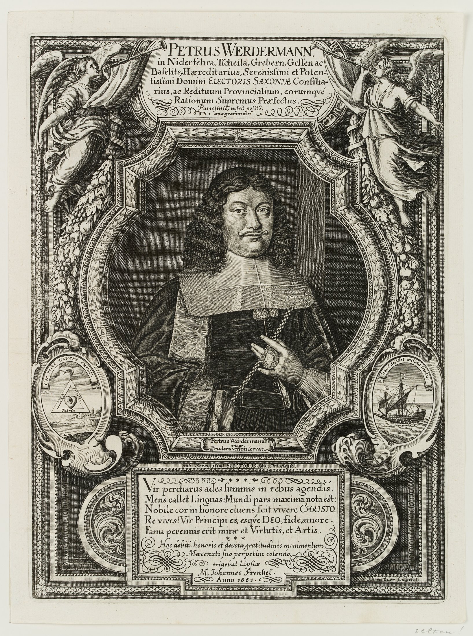 - Description: The portrait shows the councillor of the Elector of Saxony Johann Georg II, Petrus Werderman. The engraving impresses with the sober portrait in three-quarter view of the sitter, whose dignity in the portrait itself is only emphasised by holding a medal with the left hand. This contrasts with the very exuberant ornamental frame, which is decorated with precisely engraved figurative elements and figurative depictions.
