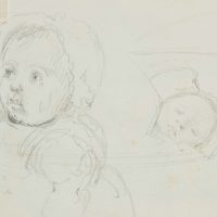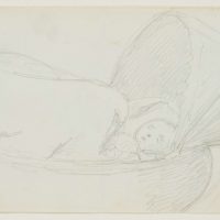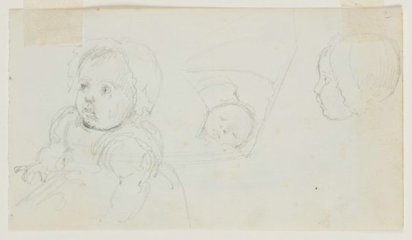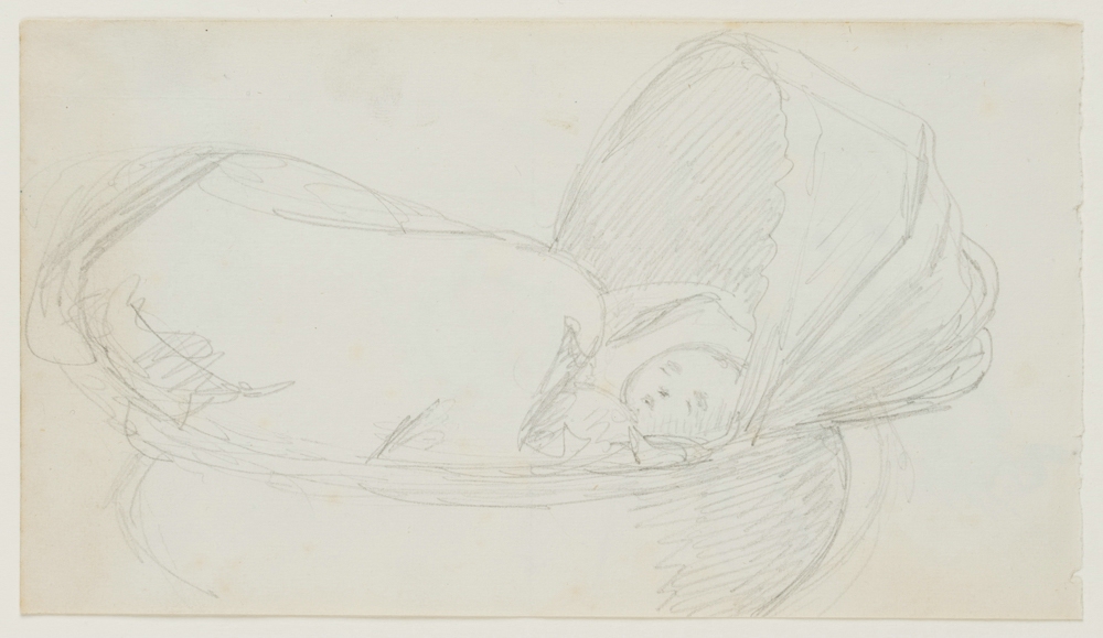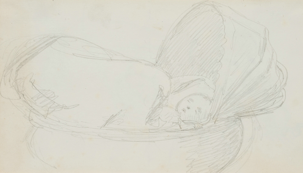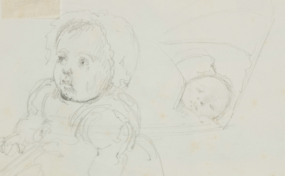 - Description: Lovely sleeping child in a cradle. On the reverse are further sketches of babies. Presumably these are the painter’s offspring. The sheet comes from a sketchbook dated 1856.