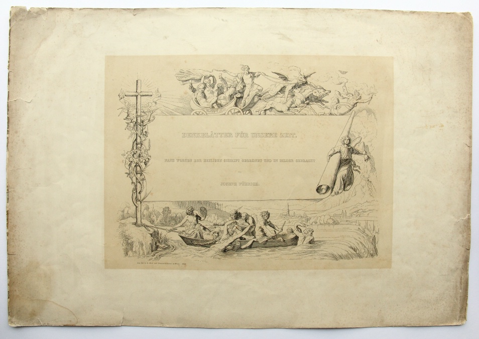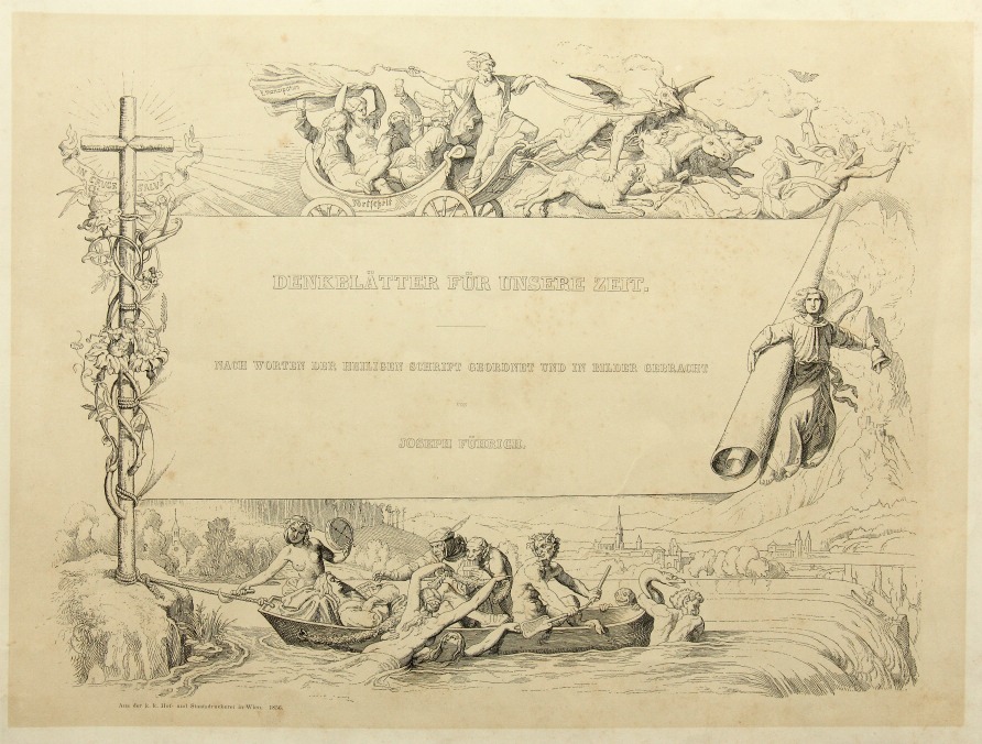 - Beschreibung: Denkblätter für unsere Zeit. Nach Worten der Heiligen Schrift geordnet und in Bilder gebracht , Deckblatt mit moralisierenden Darstellungen, Radierung auf Papier auf Papier aufgewalzt. Unterhalb der Darstellung in der Druckplatte mit einem Verweis auf die “k.k. Hof- und Staatsdruckerei in Wien” bezeichnet und auf 1856 datiert.