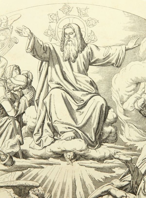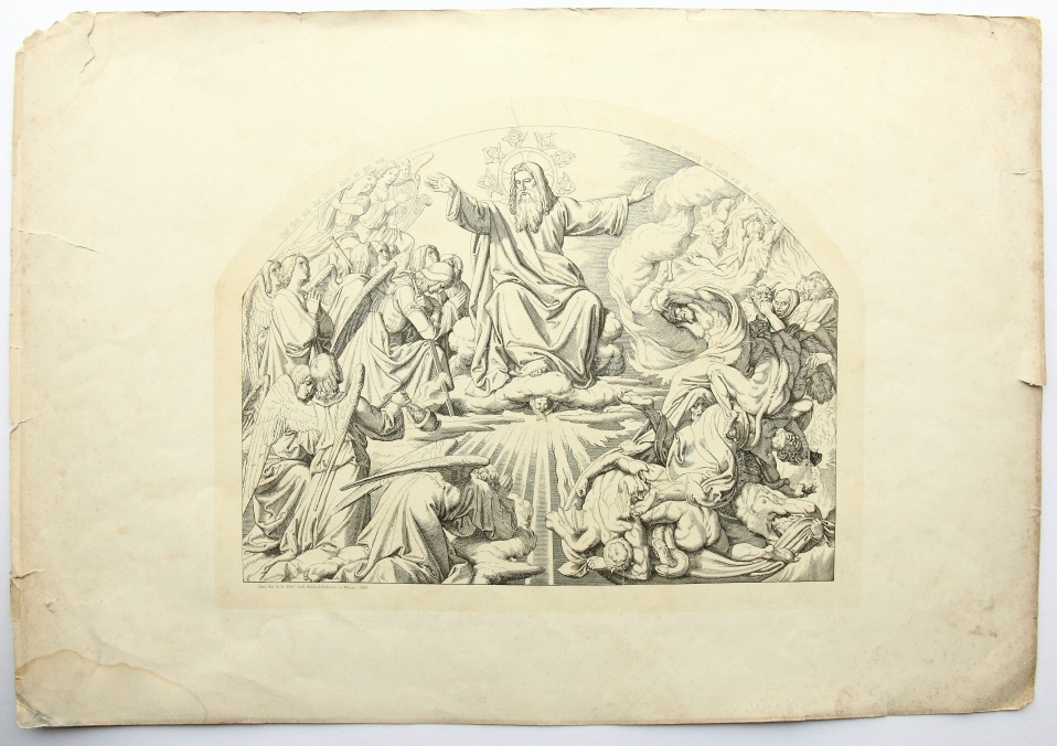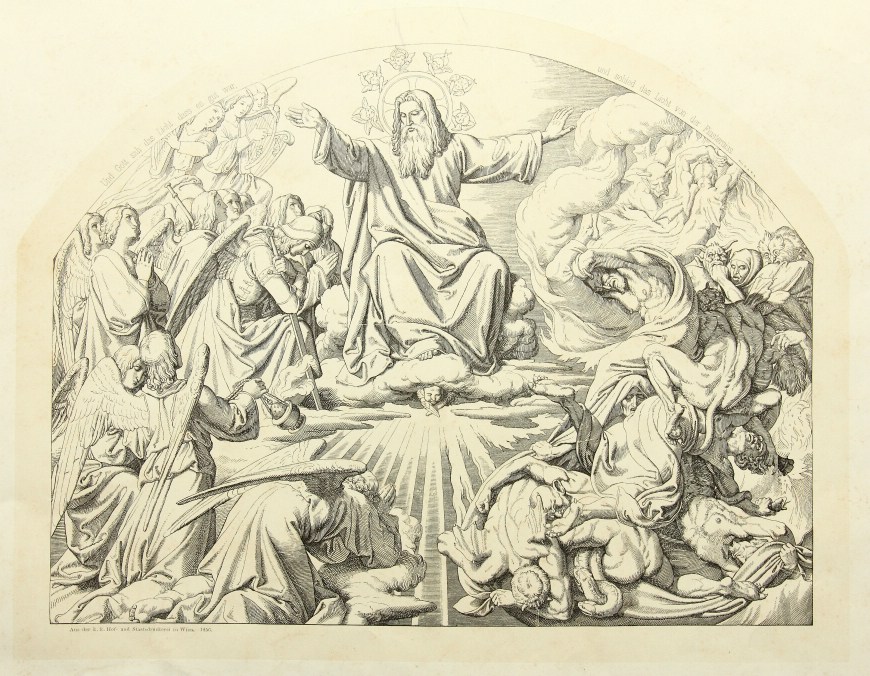 - Bezeichnung: Am Rande der Darstellung in der Druckplatte mit Bibelzitat “Und Gott sah das Licht, dass es gut war und schied das Licht von der Finsternis” und Verweis auf die “k.k. Hof- und Staatsdruckerei in Wien” bezeichnet und auf 1856 datiert.