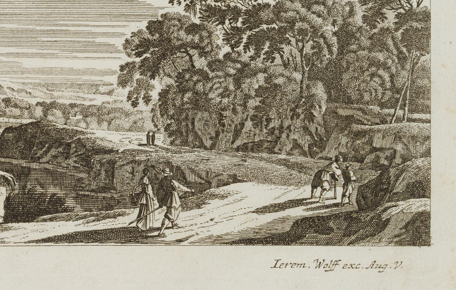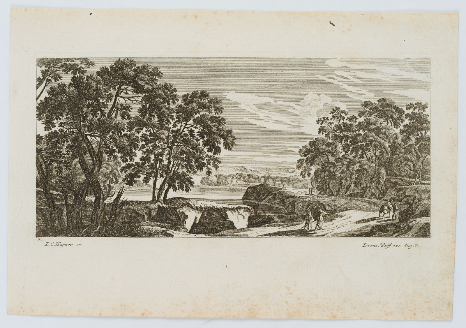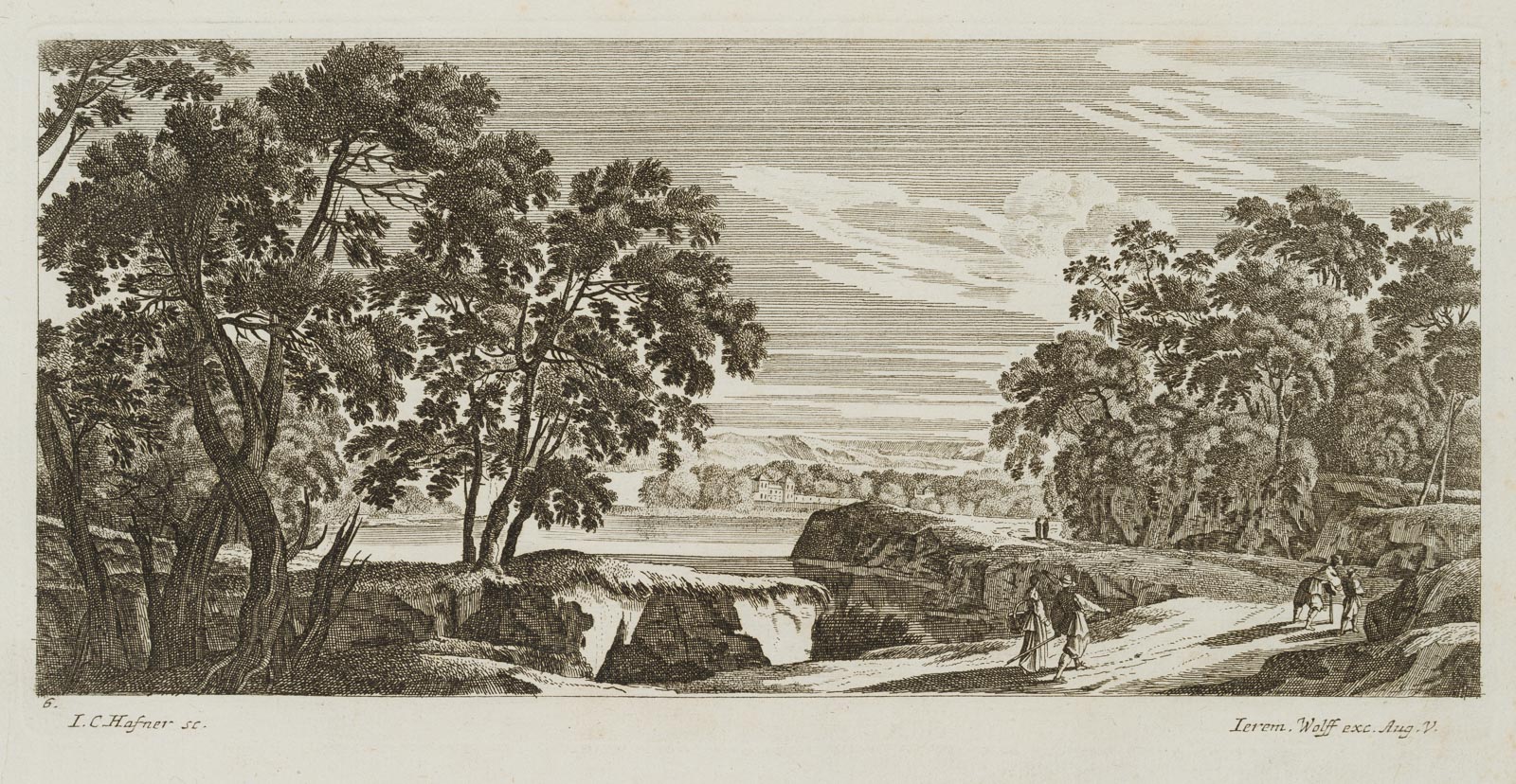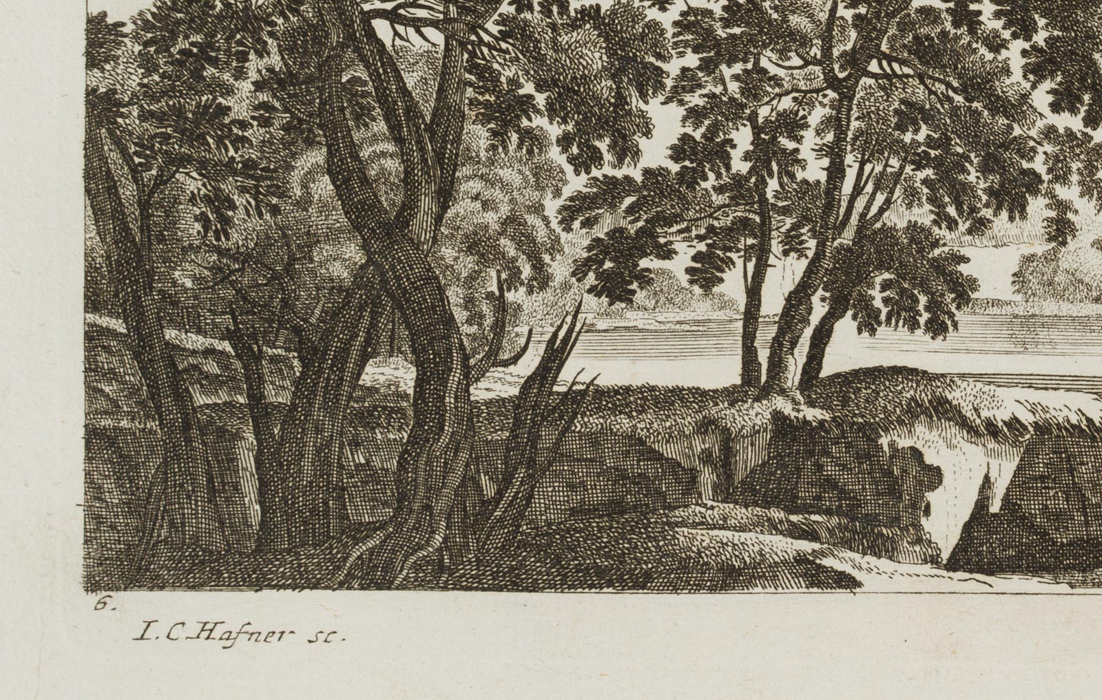 - Bezeichnung: Unten links in der Druckplatte signiert: “I. C. Hafner sc”. Herausgegeben von Jeremias Wolff (um 1663-1724) in Augsburg. Aus einer Serie von Landschaftsdarstellungen.