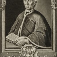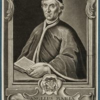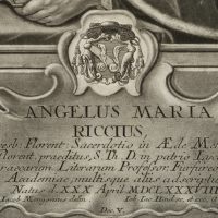 - Description: Half-length portrait in half-profile, standing with open book. Surrounded by a fictitious frame with the sitter’s coat of arms in the lower centre. Below is an inscription plate with the sitter’s name and titles, “Angelus Maria Riccius”. After a model by Giacomo Mengoni.
