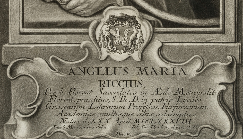 - Beschreibung: Halbfiguriges Porträt im Halbprofil, stehend mit aufgeschlagenem Buch. Umfasst von einem fingierten Rahmen mit dem Wappen des Dargestellten unten mittig. Darunter befindet sich eine Inschriftentafel mit Namen und Titeln des Dargestellten, “Angelus Maria Riccius”. Nach einer Vorlage von Giacomo Mengoni.