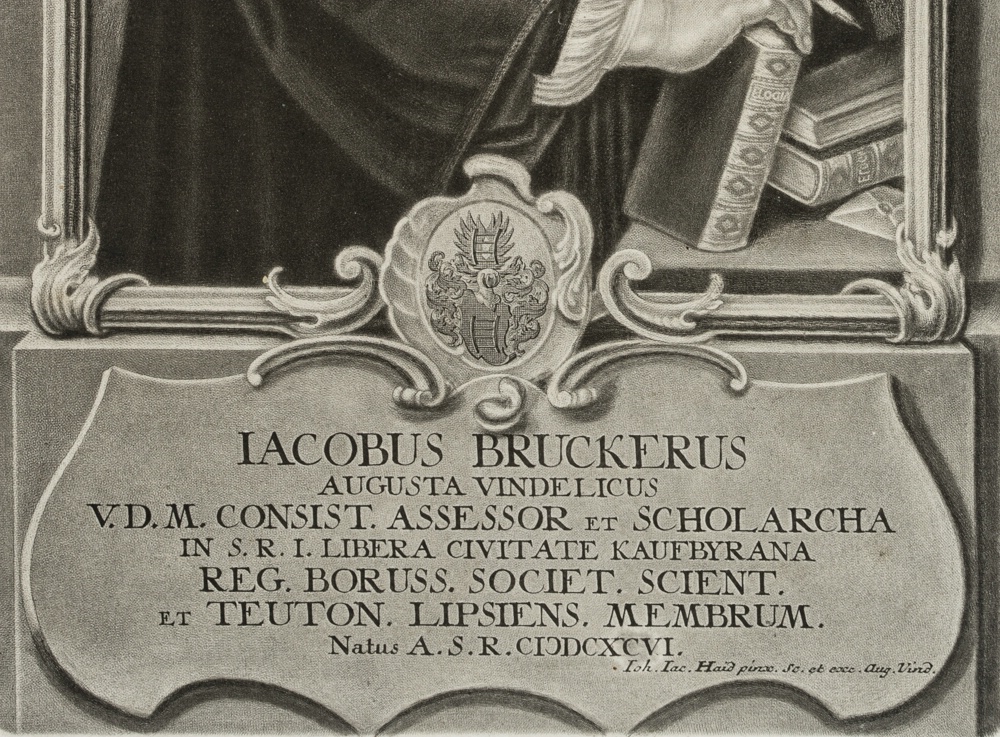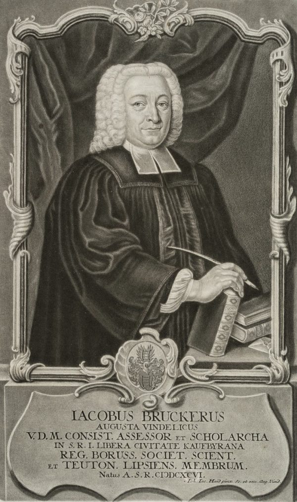 Johann Jakob Haid (1704 Kleineislingen – 1767 Augsburg), Porträt des deutschen evangelischen Theologen Johann Jakob Brucker (1696 Augsburg – 1770 ebd), Schulrektor und Philosophiehistoriker, um 1750, Mezzotinto