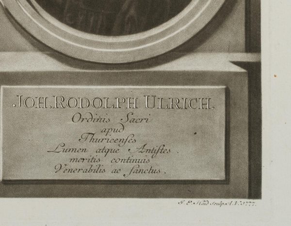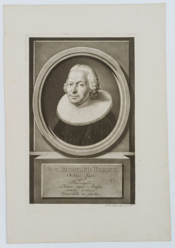 - Bezeichnung: Unterhalb der Graphik in der Druckplatte beschriftet mit “Joh. Rodolph Ulrich | Ordinis Sacri apud Thuricenses Lumen atque Antistes meritis continuis Venerabilis ac Sanctus”, rechts darunter signiert und datiert.