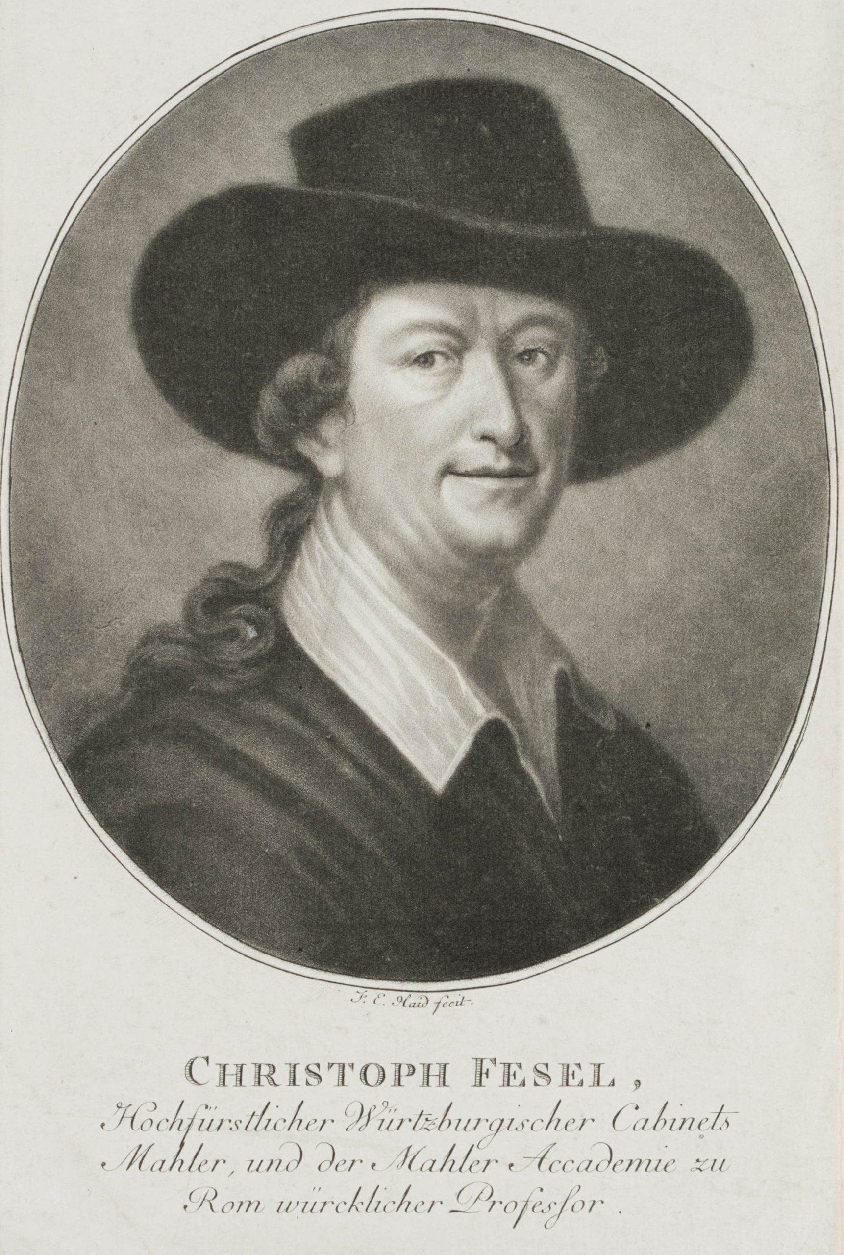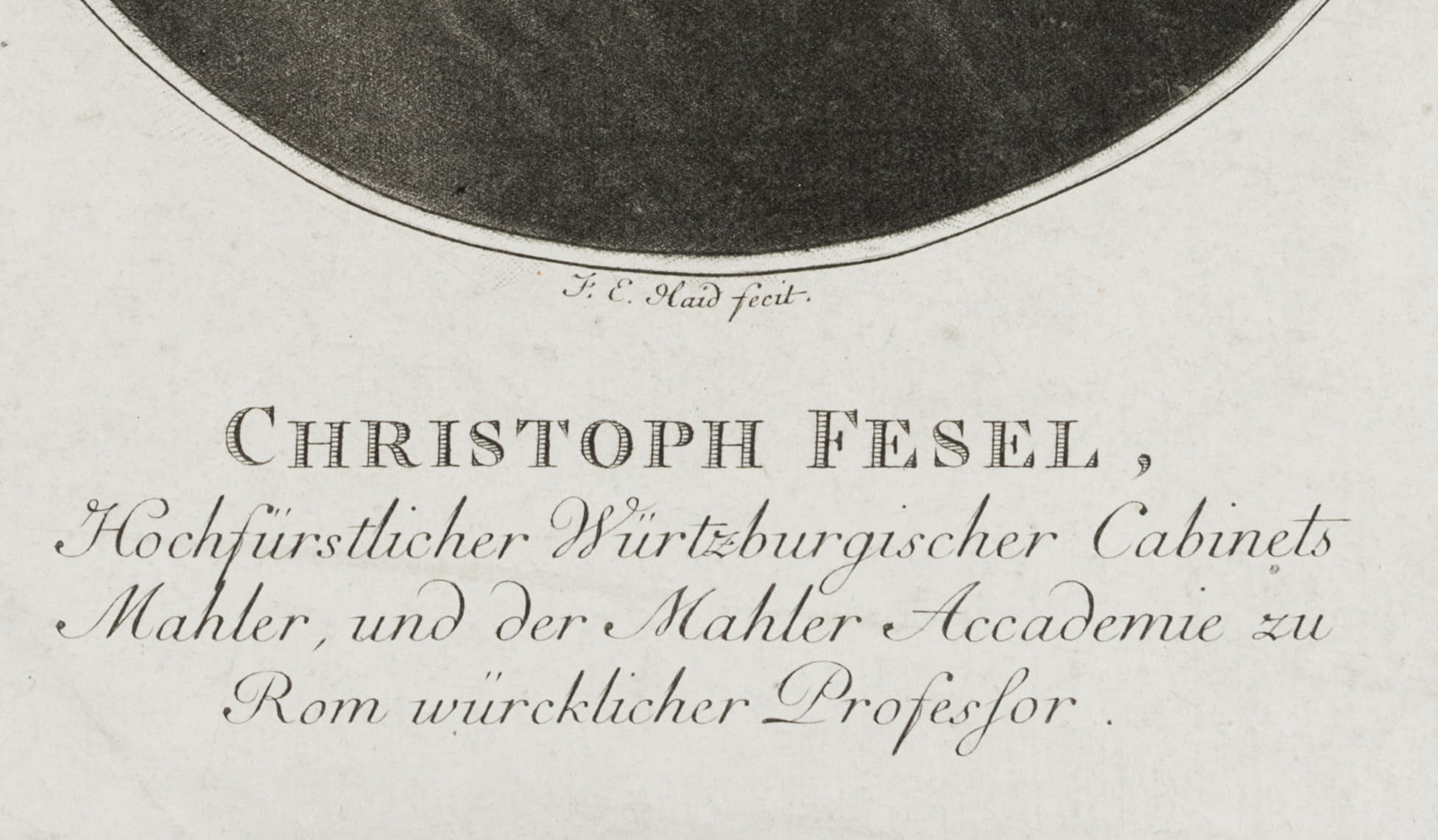 - Bezeichnung: Unterhalb der Darstellung in der Druckplatte signiert und bezeichnet: “J. E. Haid fecit | Christoph Fesel, Hochfürstlicher Würtzburgischer Cabinets mahler, und der Mahler Academie zu Rom würcklicher Professor.”