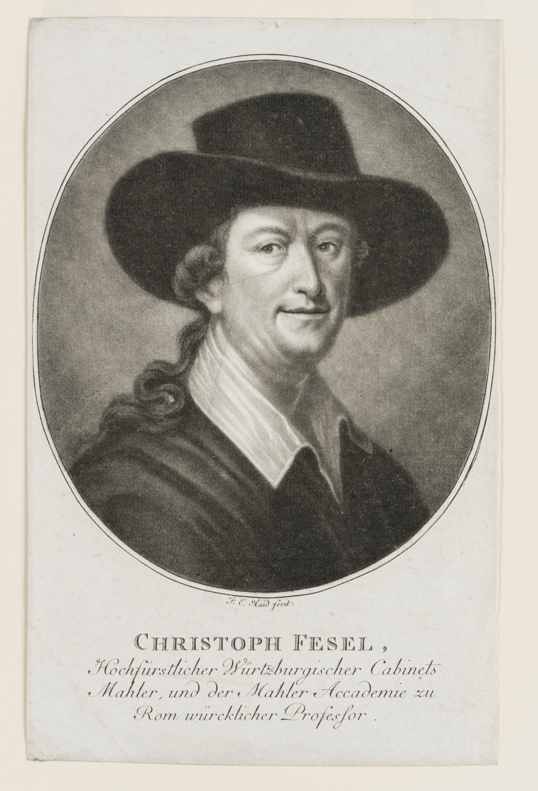 - Inscription: Signed and inscribed in the printing plate below the image: “J. E. Haid fecit | Christoph Fesel, Hochfürstlicher Würtzburgischer Cabinets mahler, und der Mahler Academie zu Rom würcklicher Professor”.
