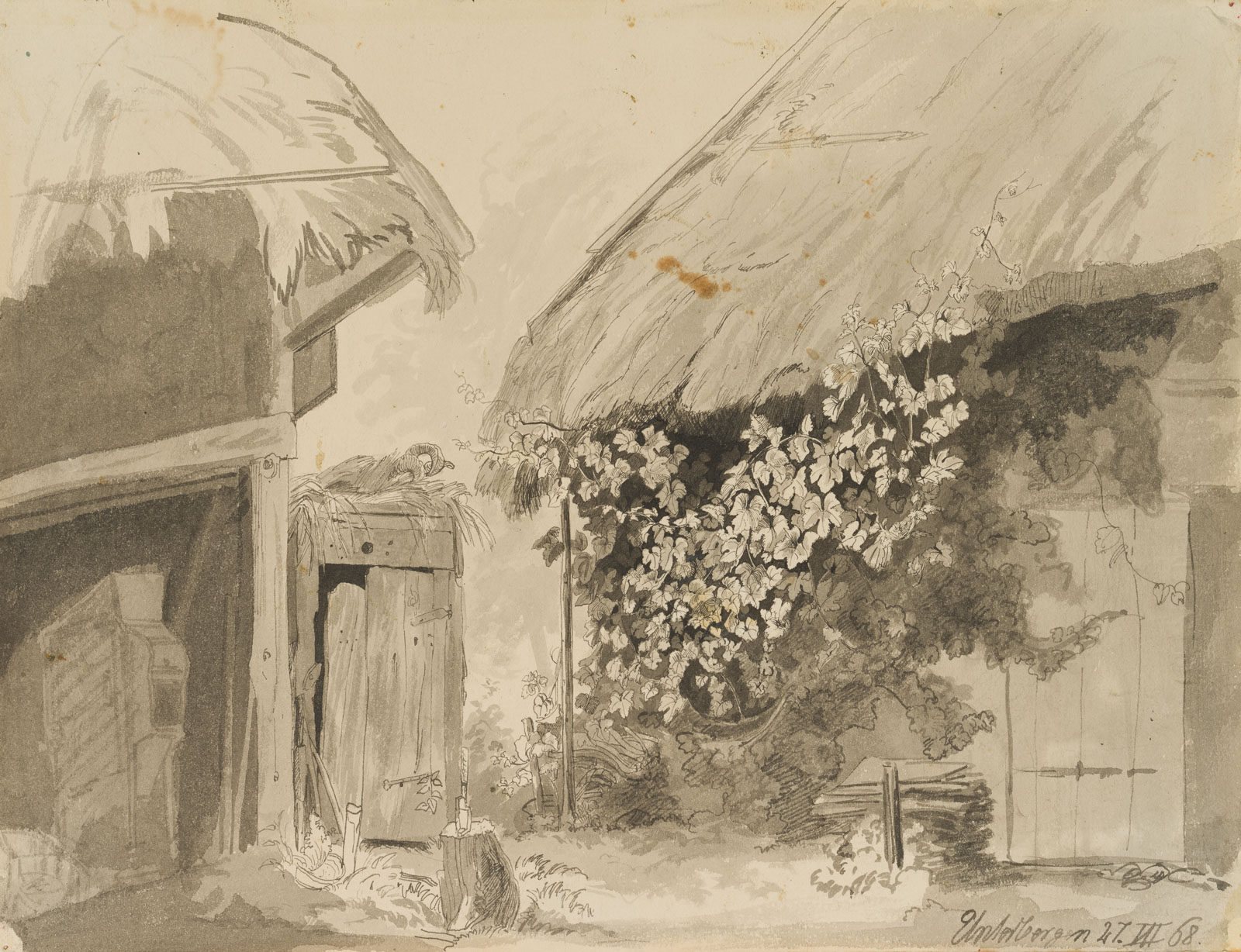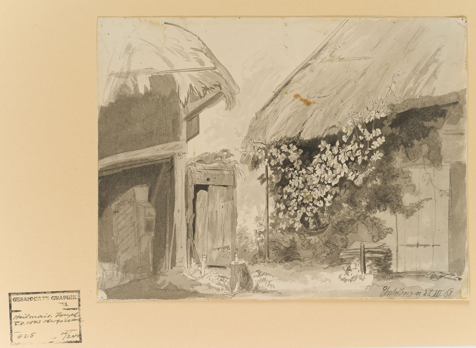 Joseph Heilmair (1843 Obergrießbach, Lower Bavaria – after 1923 Munich), Stables and sheds in Unterbergen, 1868, Brush drawing