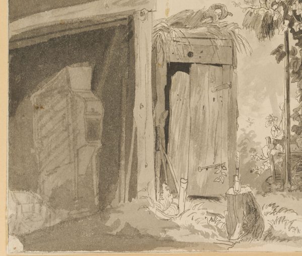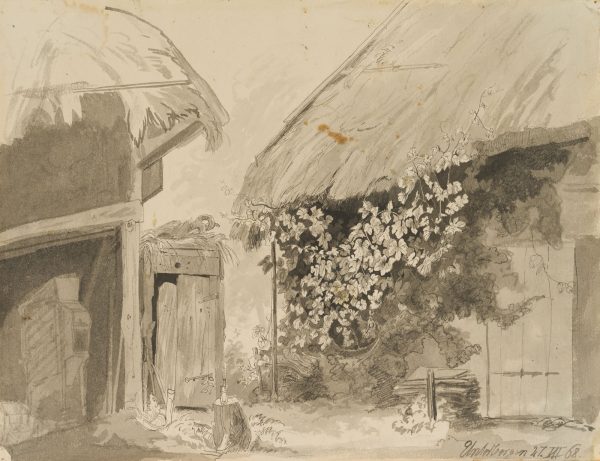 Joseph Heilmair (1843 Obergrießbach, Nieder-Bayern – nach 1923 München), Ställe und Schuppen in Unterbergen, 1868, Pinselzeichnung