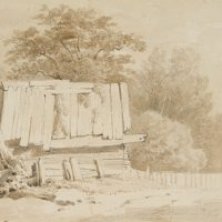 Joseph Höger (1801 Vienna – 1877 ibid.), Old wooden shed at the edge of the forest, 19th century, Indian ink