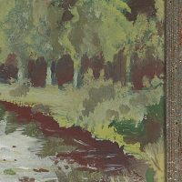 - Bezeichnung: unten rechts vom Künstler monogrammiert: “IH”, verso bezeichnet: “Partie im Hönnetal Orig. Oel Jos. Hötgen”