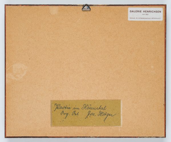- Inscription: Monogrammed lower right by the artist: “IH”, inscribed on verso: “Partie im Hönnetal Orig. Oel Jos. Hötgen”.